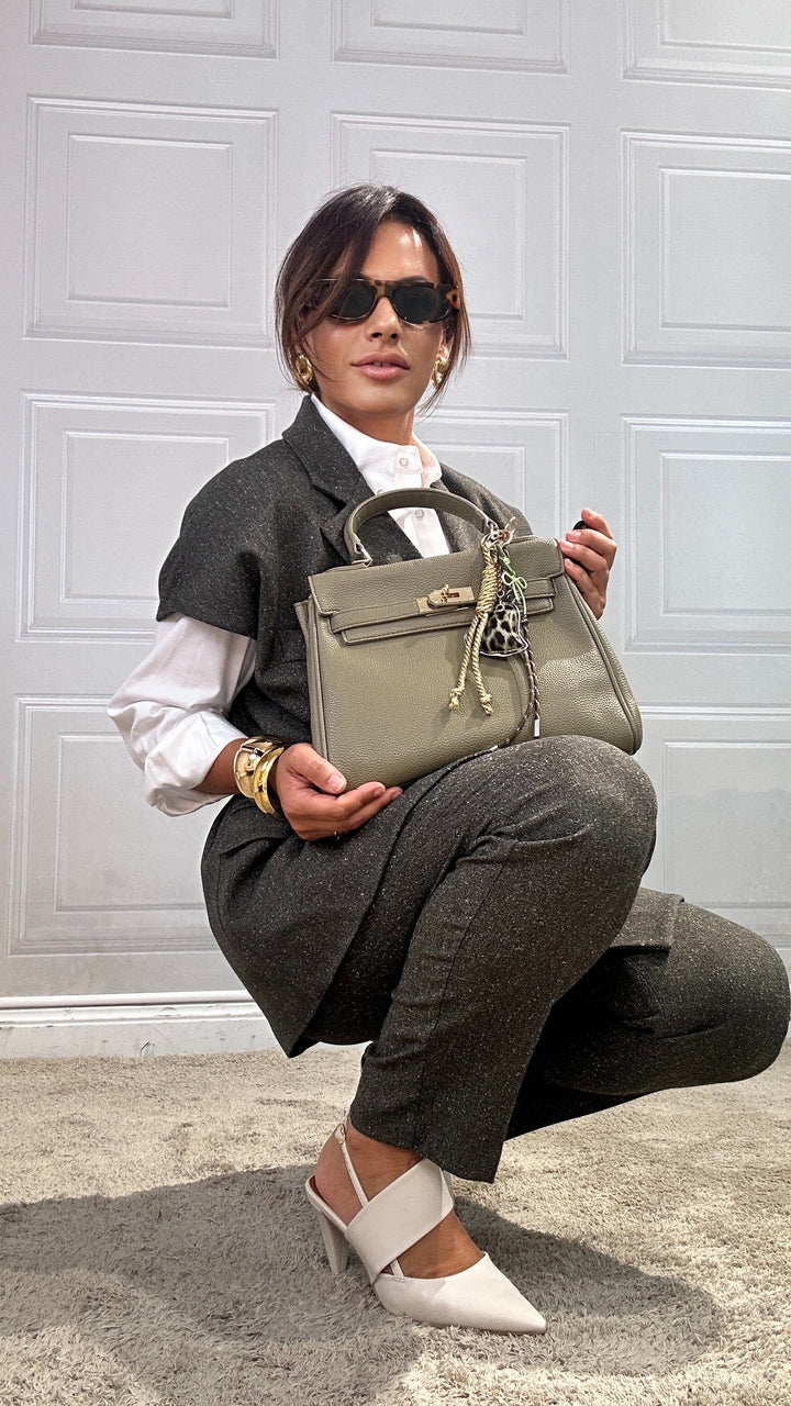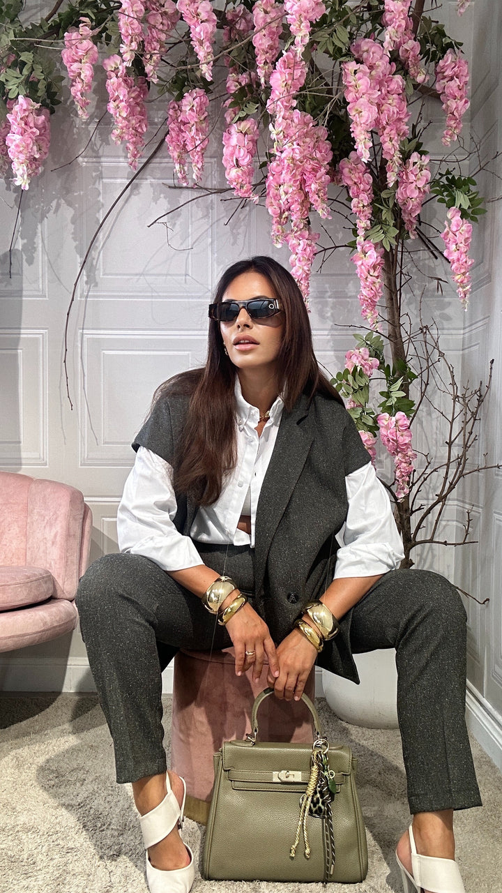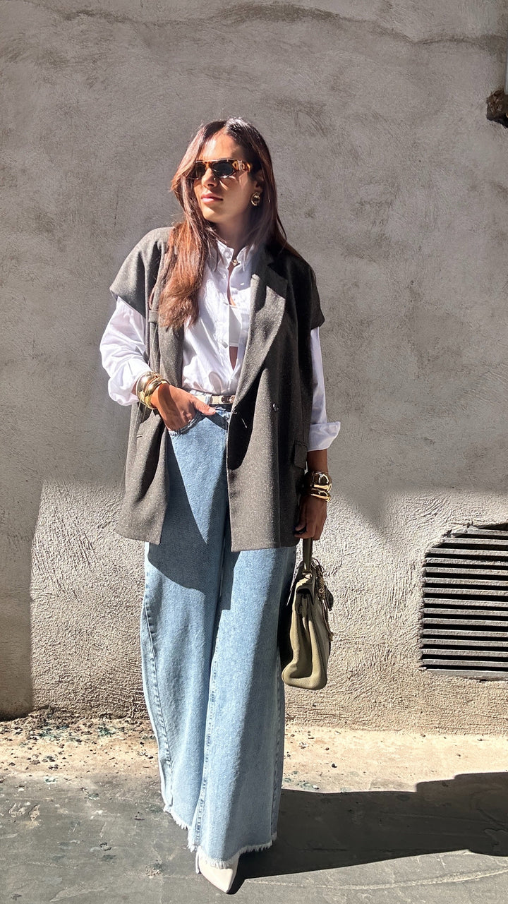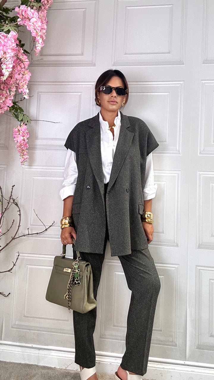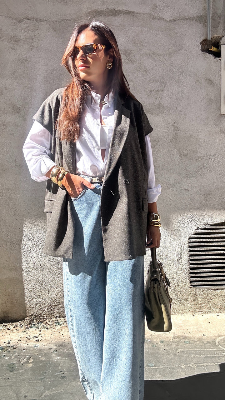 Abbinato a una camicia bianca e pantaloni coordinati, il gilet crea un look armonioso e versatile, perfetto per diverse occasioni, da eventi formali a incontri casual. L'outfit è completato con accessori come una borsa elegante e occhiali da sole, che aggiungono un ulteriore elemento di stile.