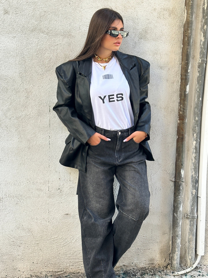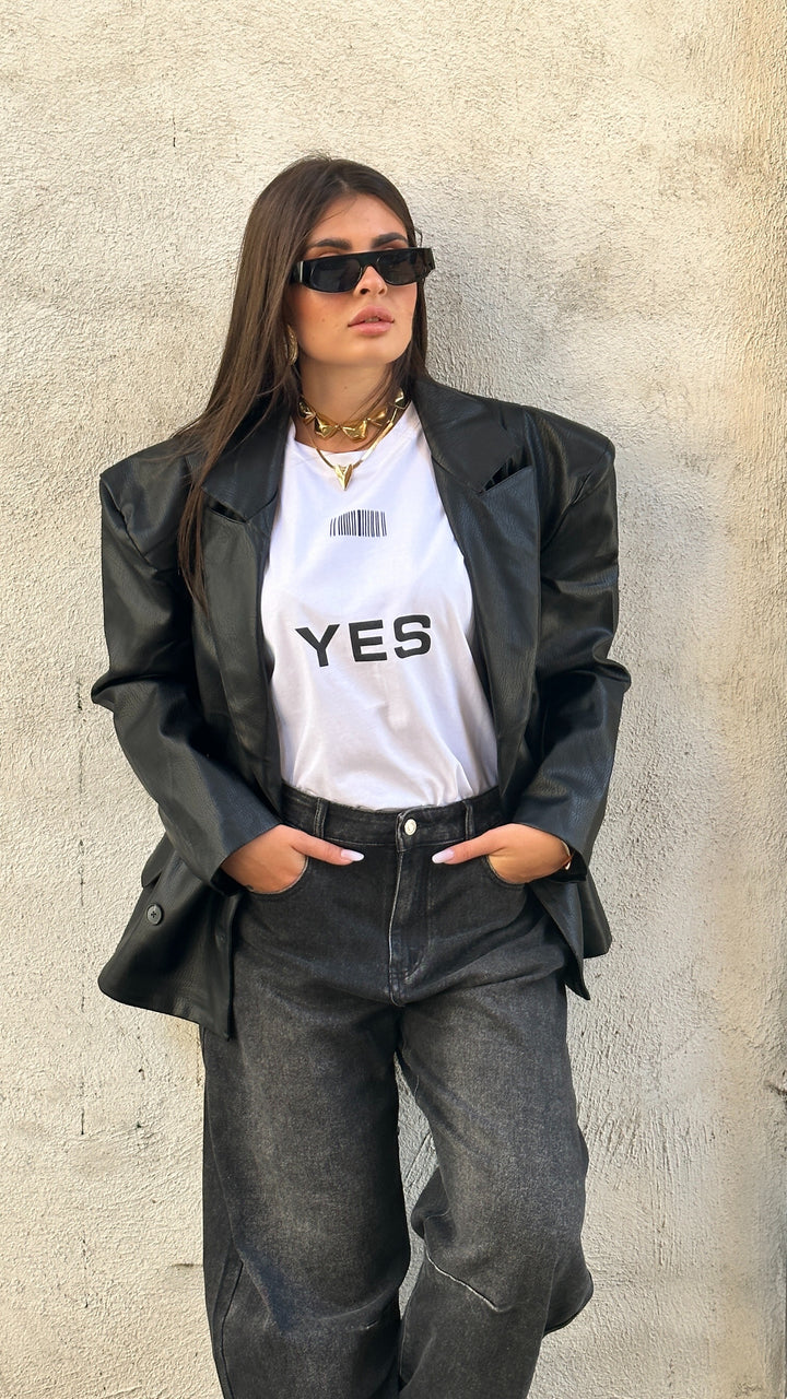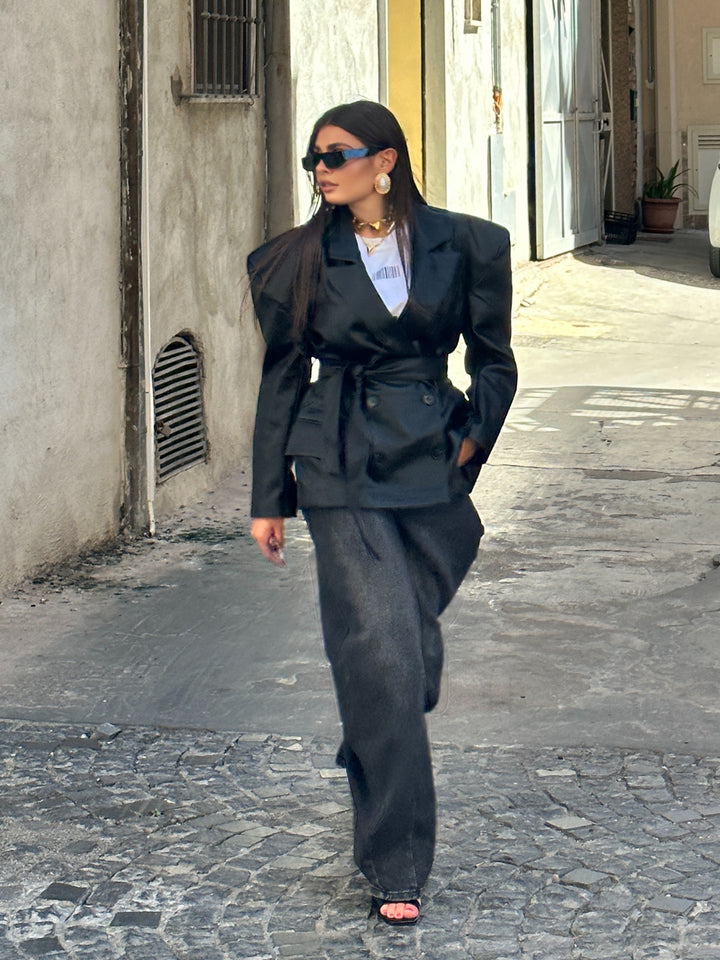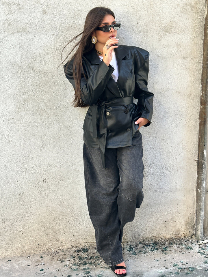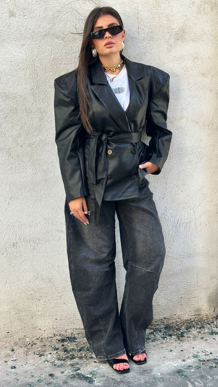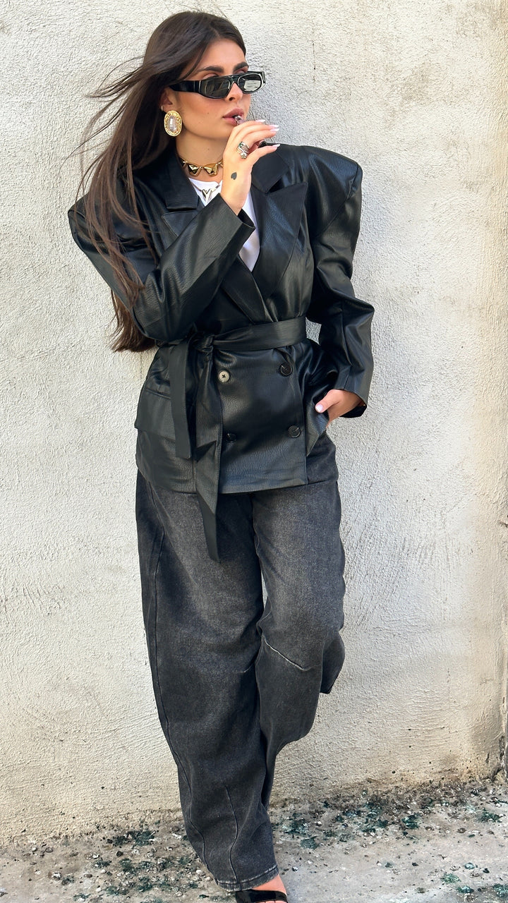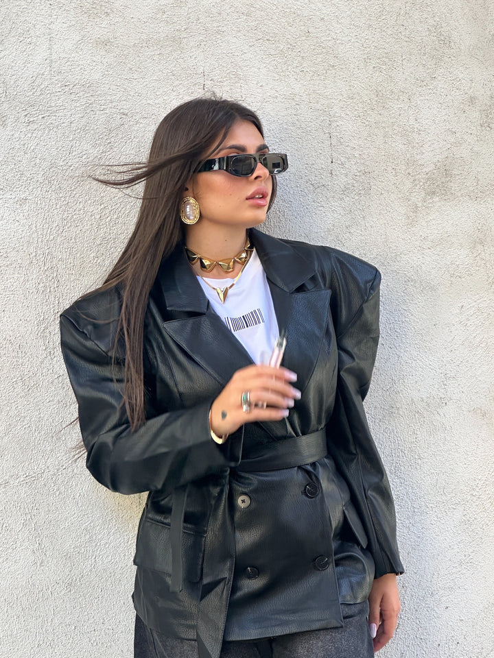 Giubbotto in simil pelle modell trench modello doppio petto. Manica a palloncino. E cintura abbinata dello stesso tessuto e colore. Veste fino alla 46