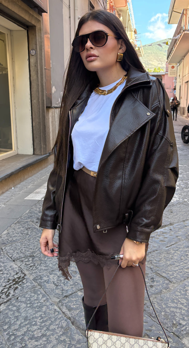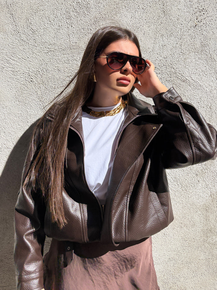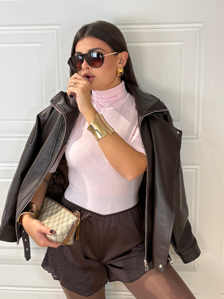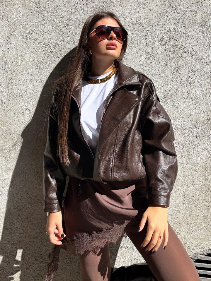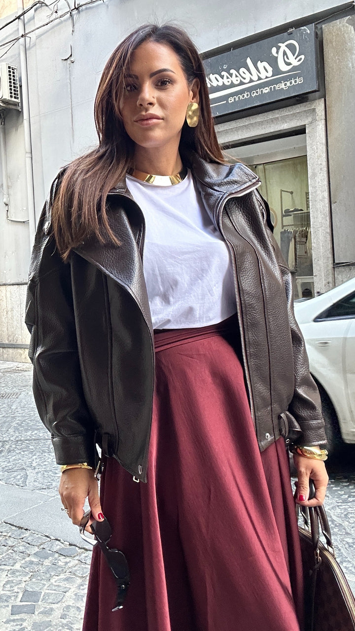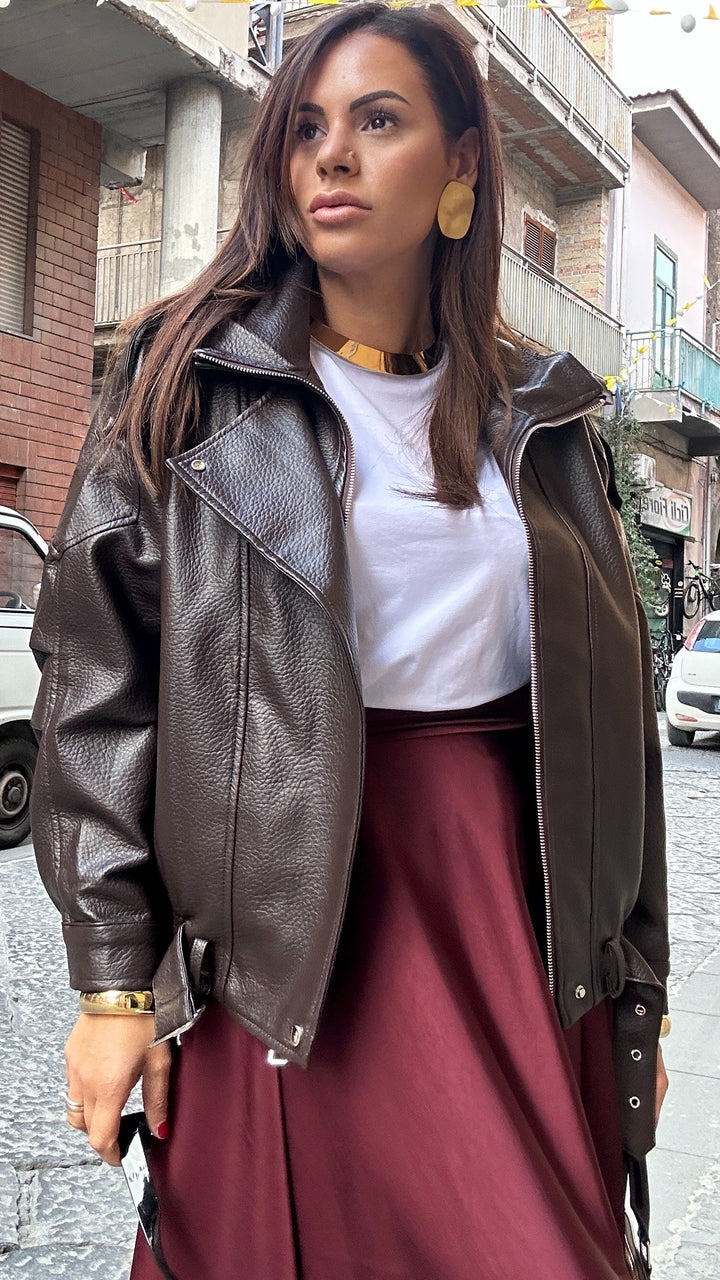 Giubbotto in simil pelle effetto bomber chiusura con cerniera in acciaio elastico in vita che fa l'effetto bomber maniche a sbuffo con polsino e che anche loro hanno la chiusura con ciappette tasche sui fianchi