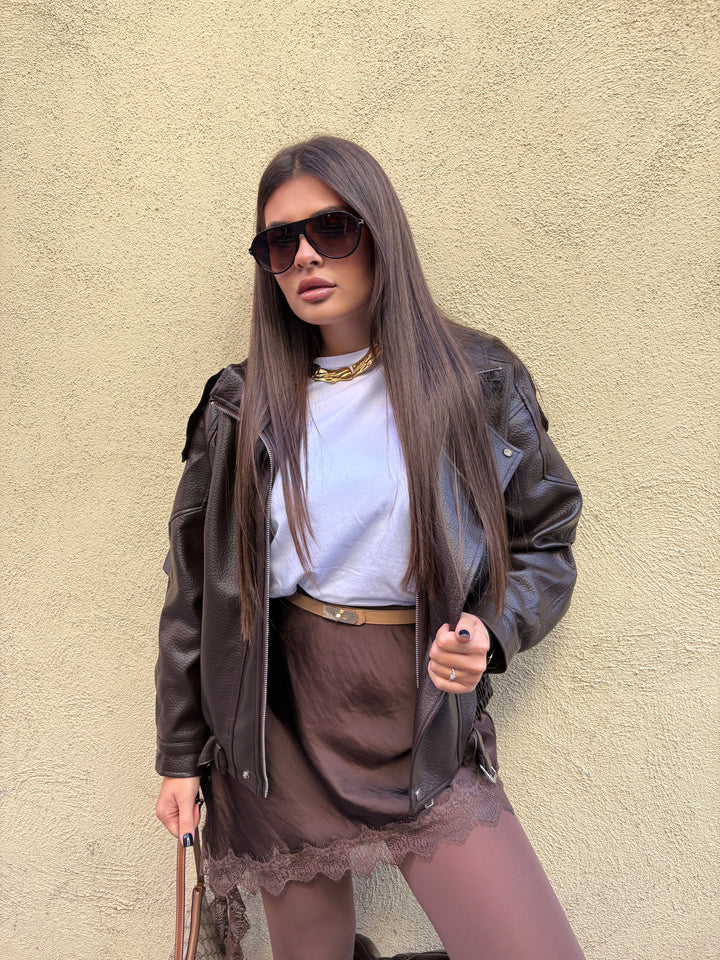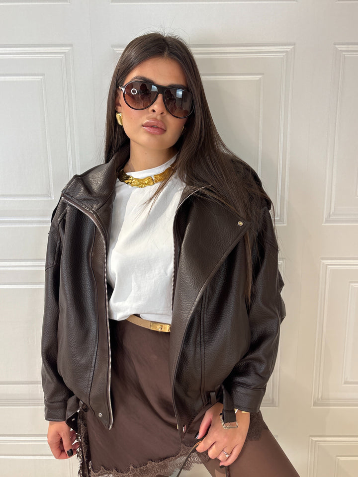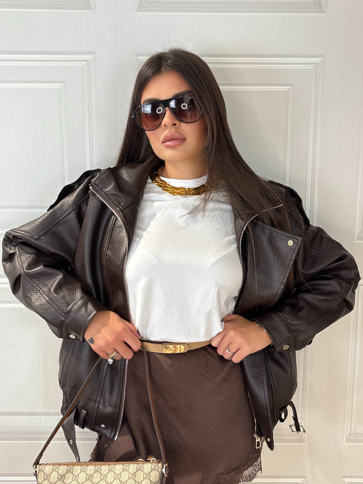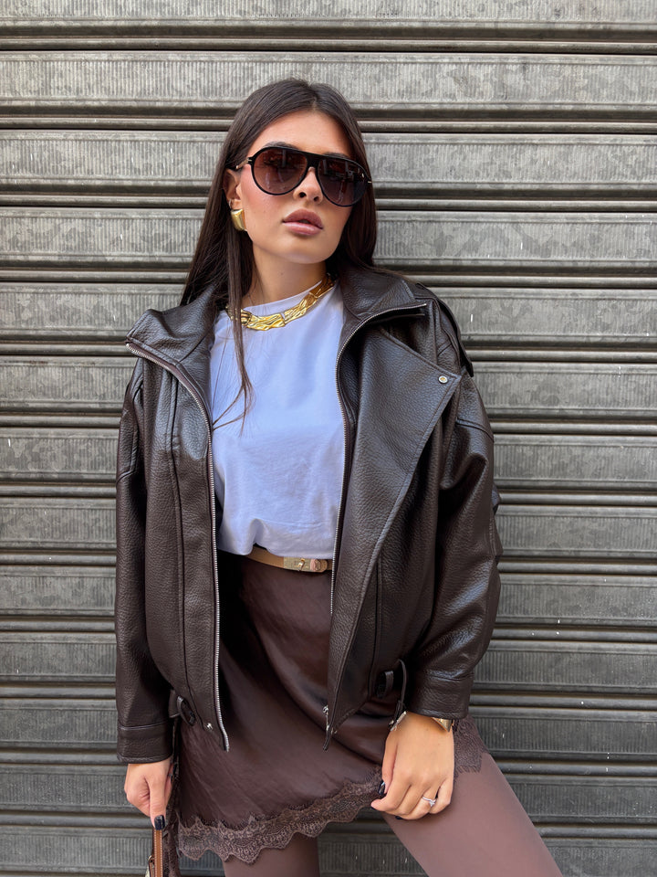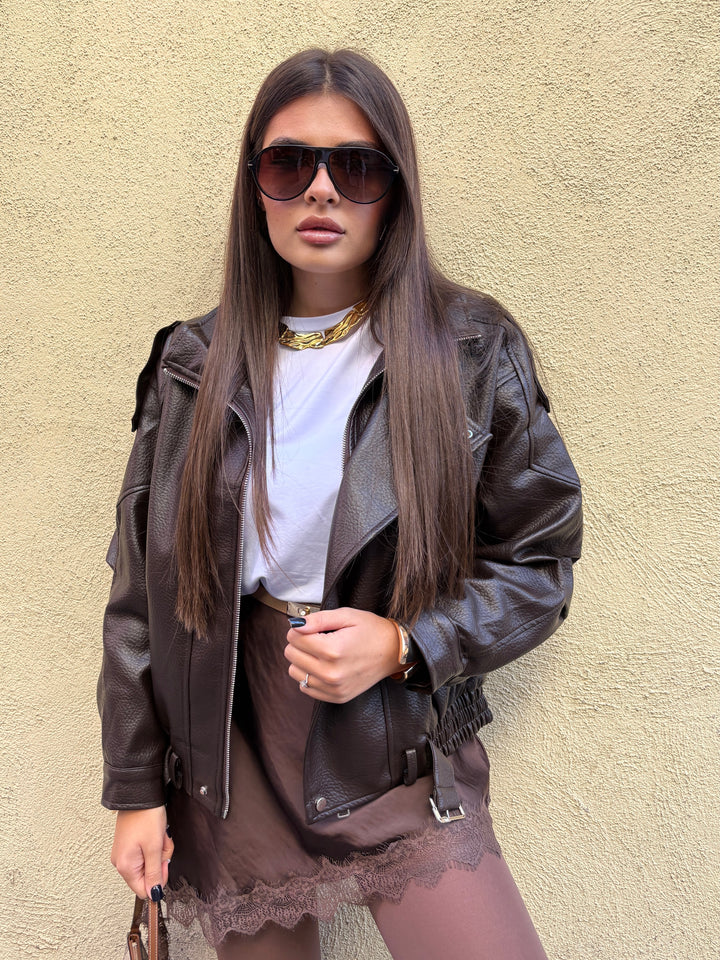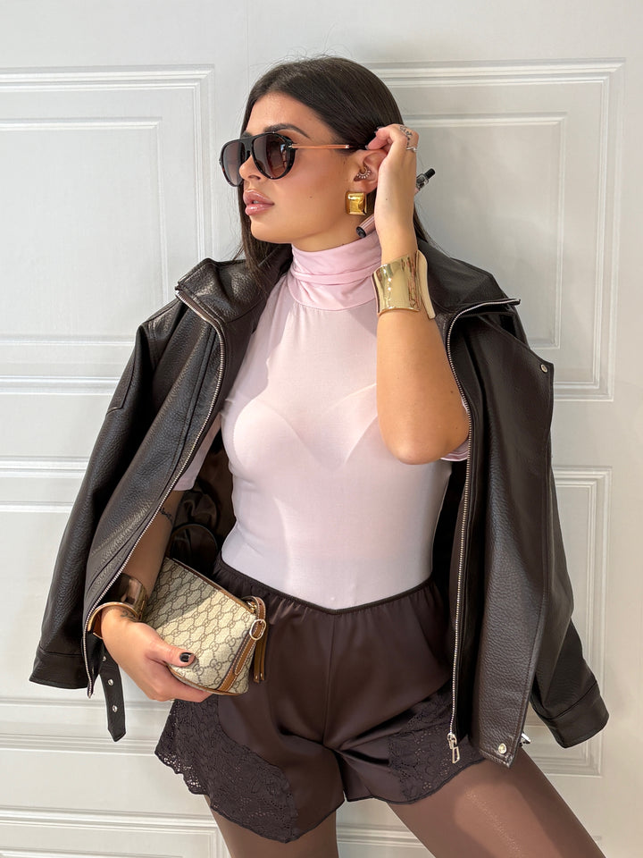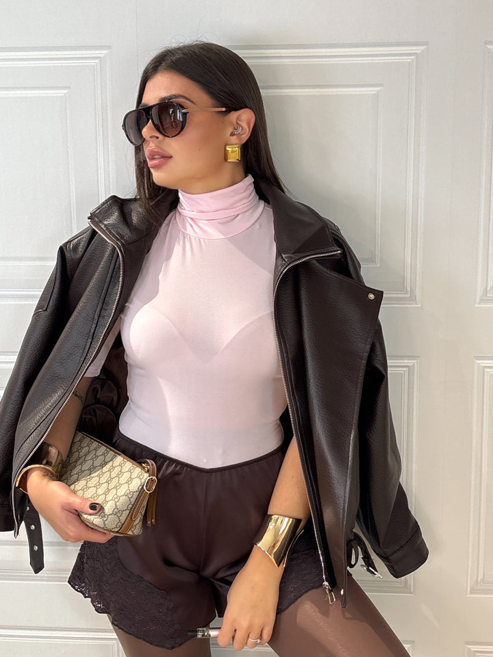 Giubbotto in simil pelle effetto bomber chiusura con cerniera in acciaio elastico in vita che fa l'effetto bomber maniche a sbuffo con polsino e che anche loro hanno la chiusura con ciappette tasche sui fianchi