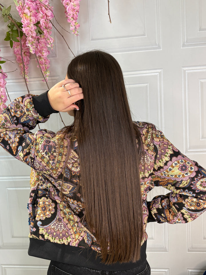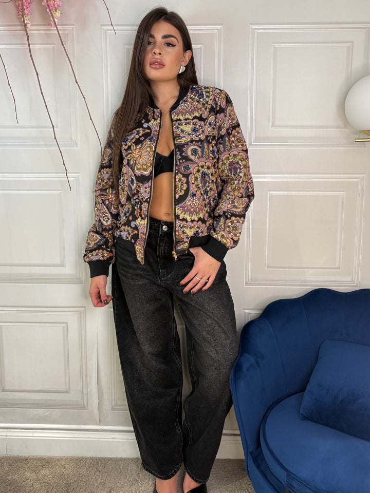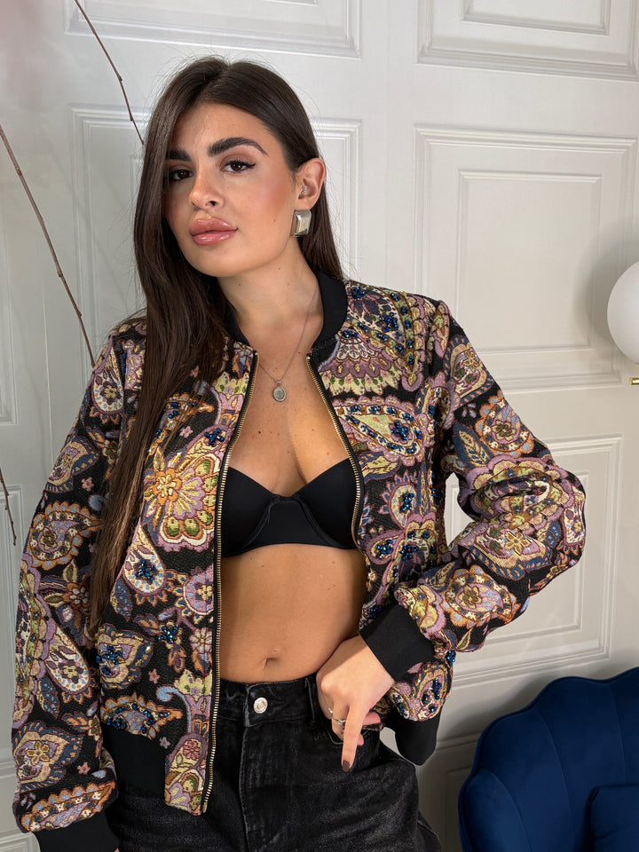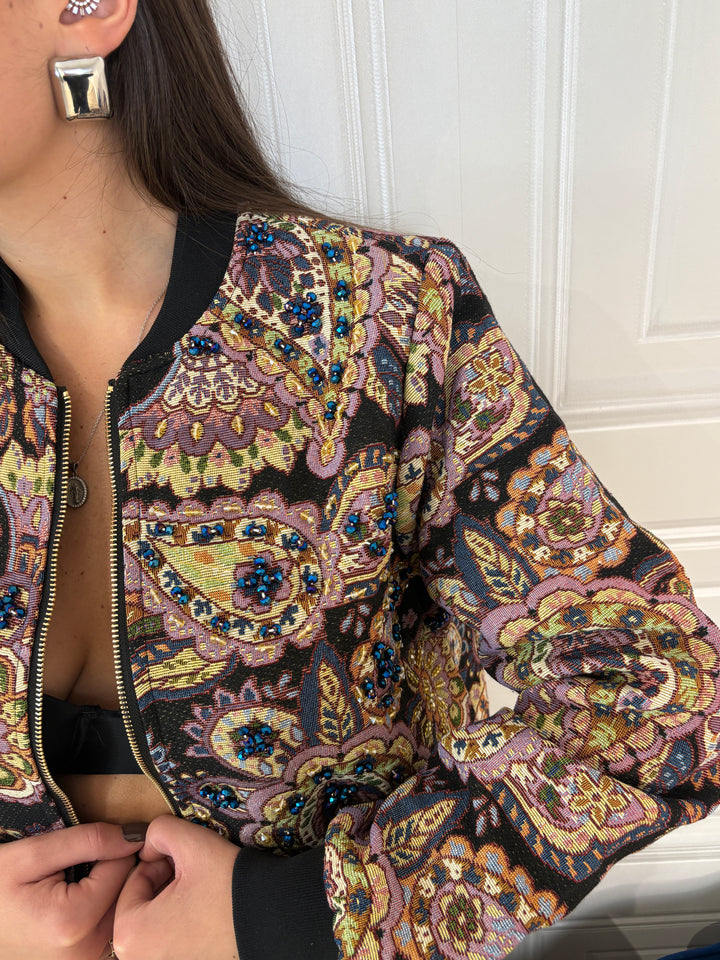 Giubotto dalla fantasia orientale con dettaglio di perline blu applicate. Ha la cerniera sul davanti e l’effetto bomber