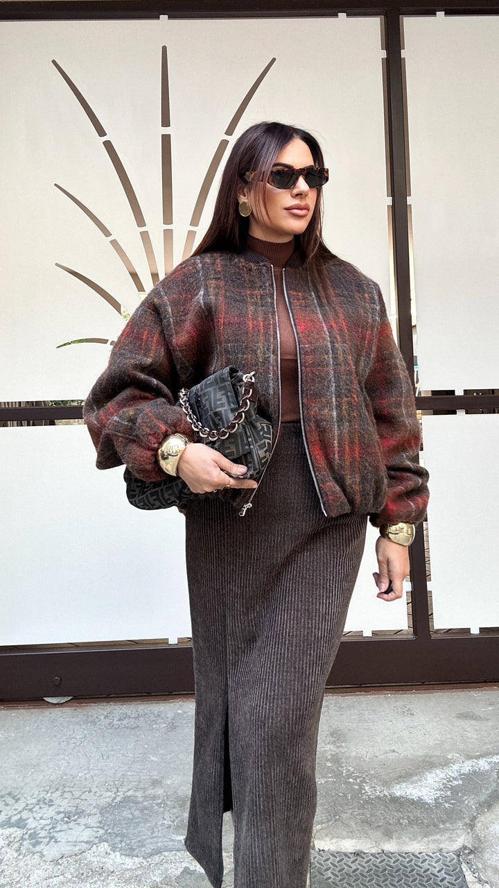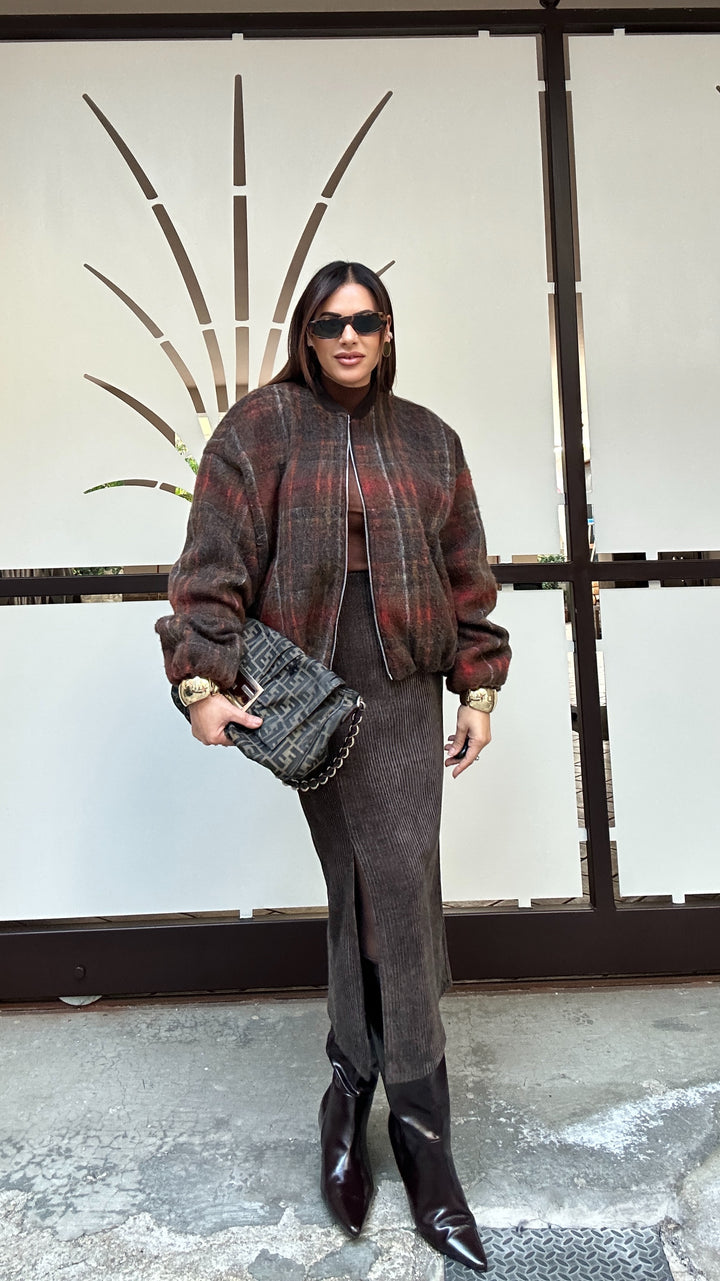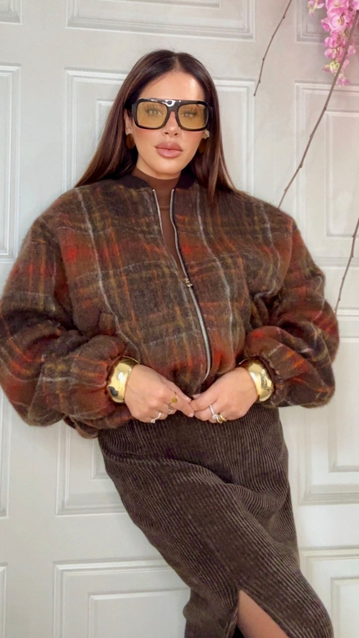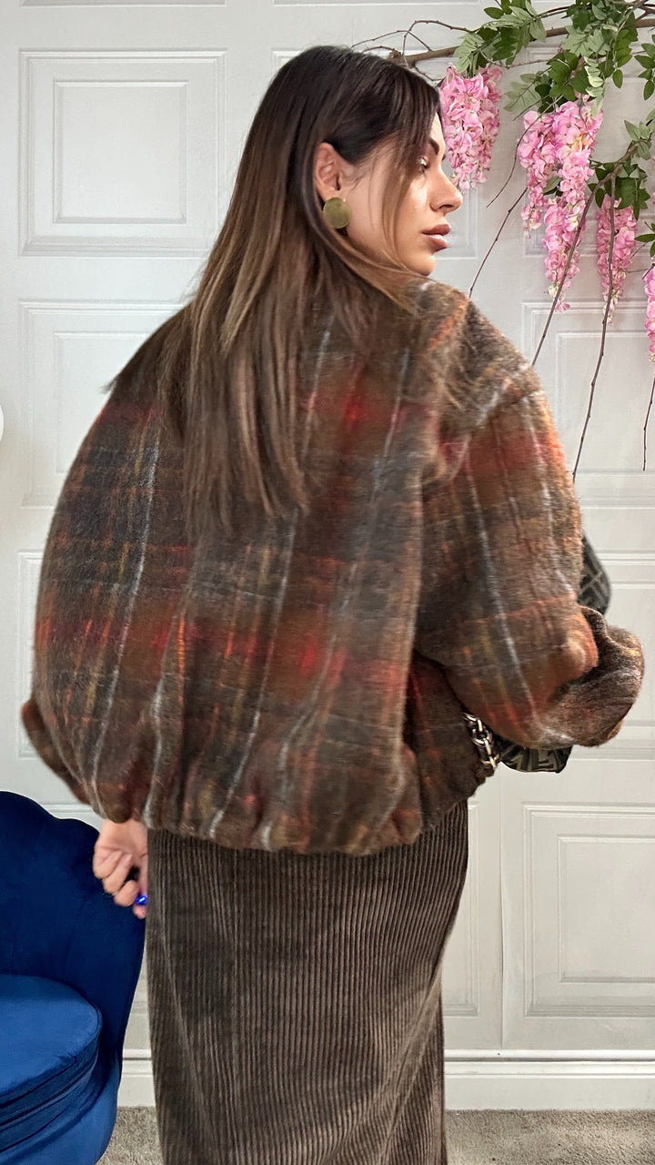 Giubbotto fantasia tartan in Lana. Ha questo effetto bomber grazie alla molla elastica che porta alla base. Ha là zip sul davanti veste bene fino alla taglia 46
