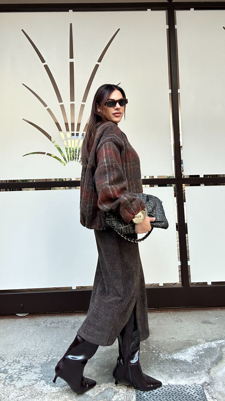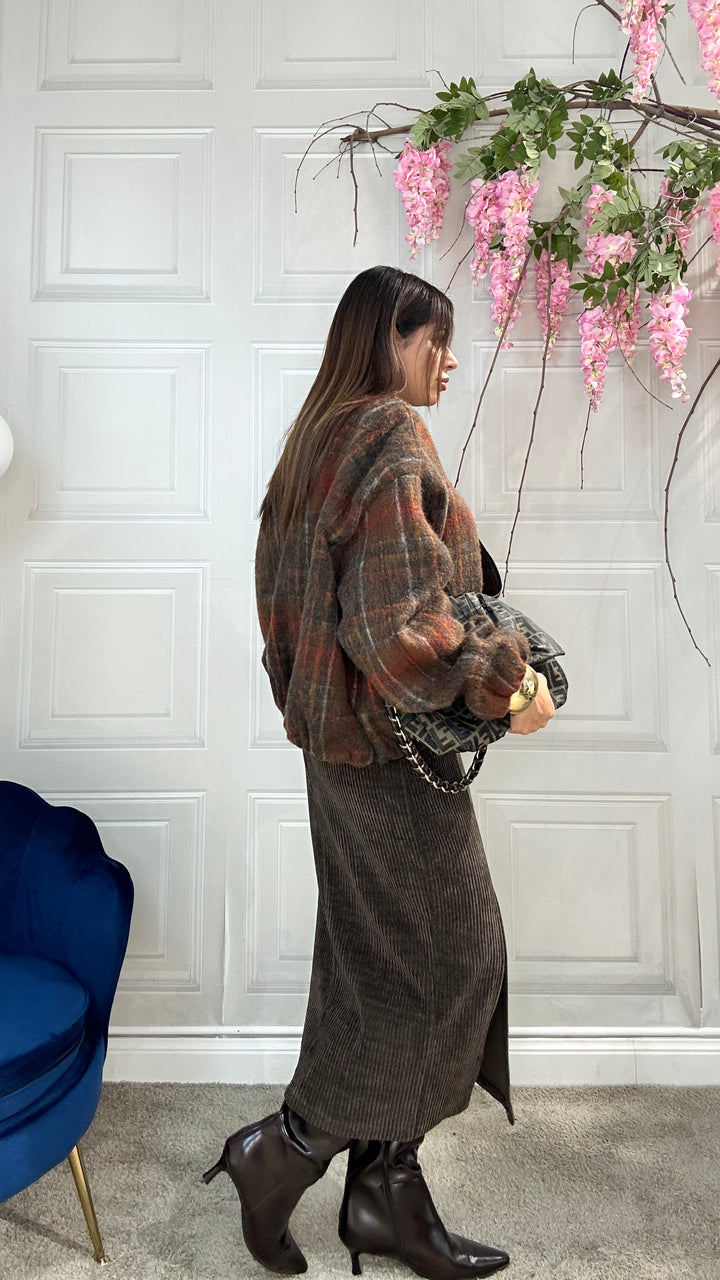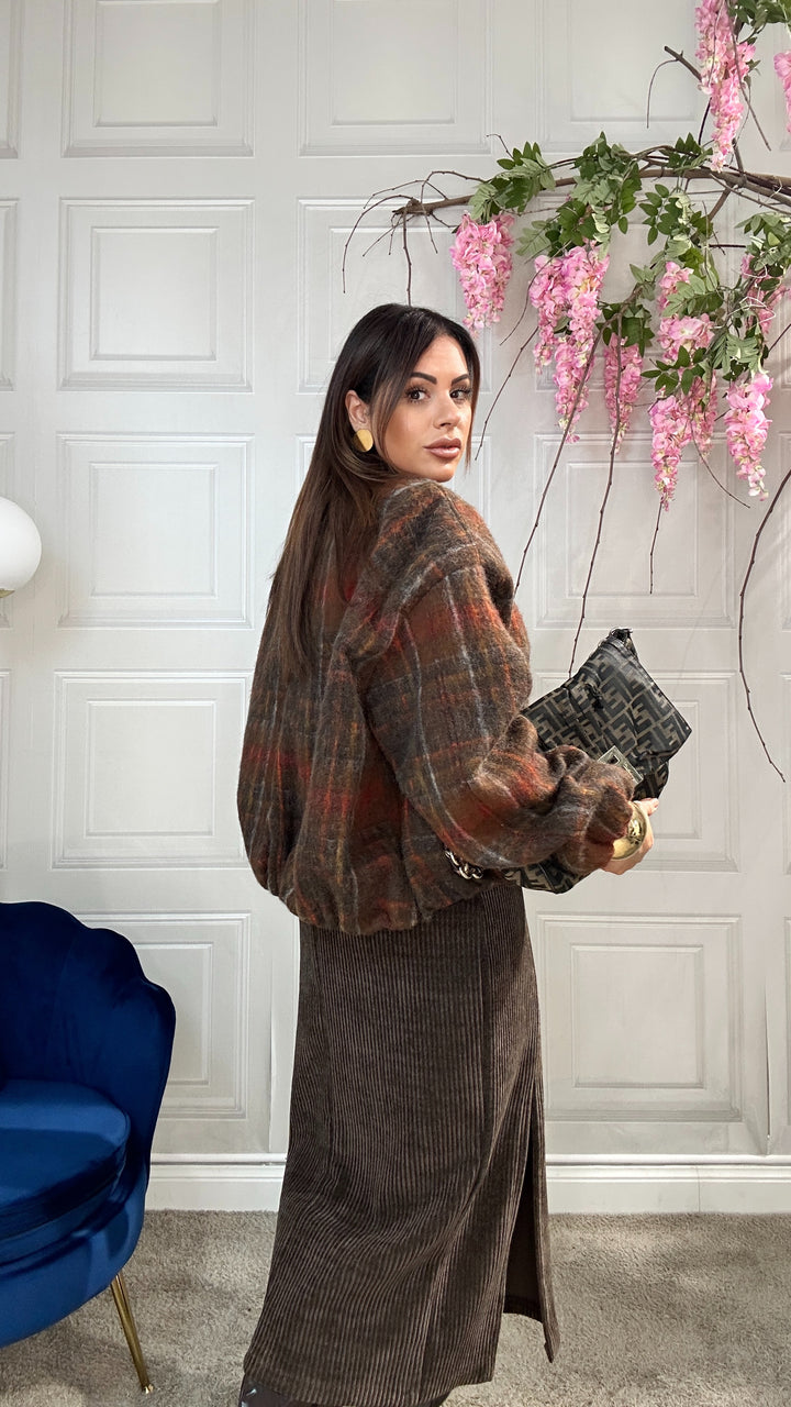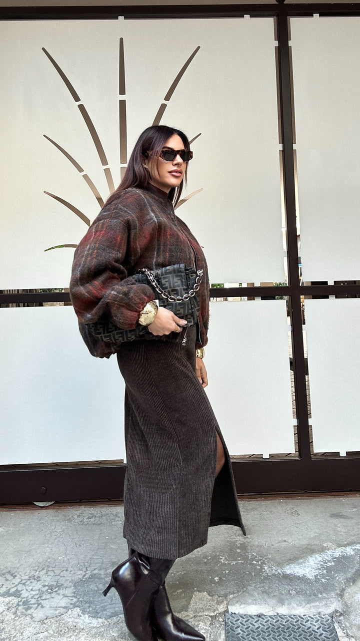 Giubbotto fantasia tartan in Lana. Ha questo effetto bomber grazie alla molla elastica che porta alla base. Ha là zip sul davanti veste bene fino alla taglia 46
