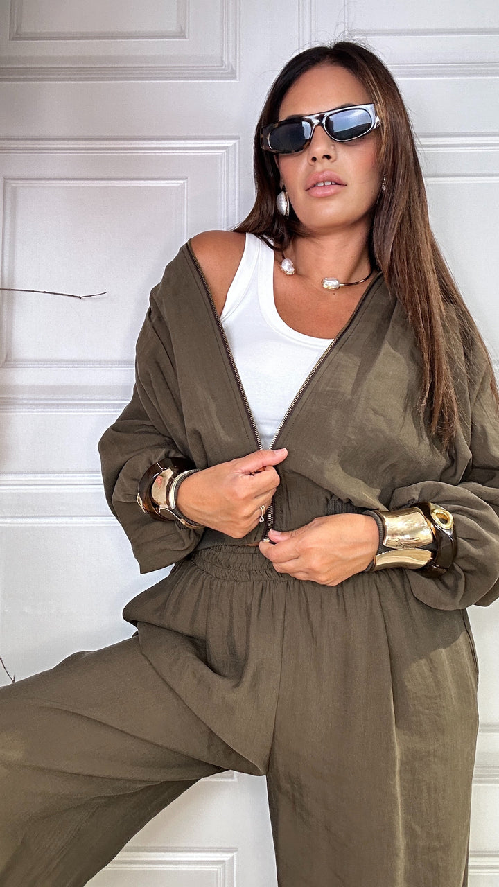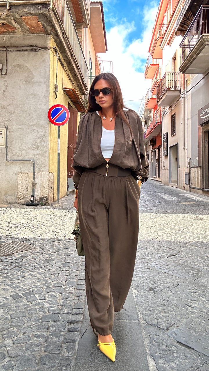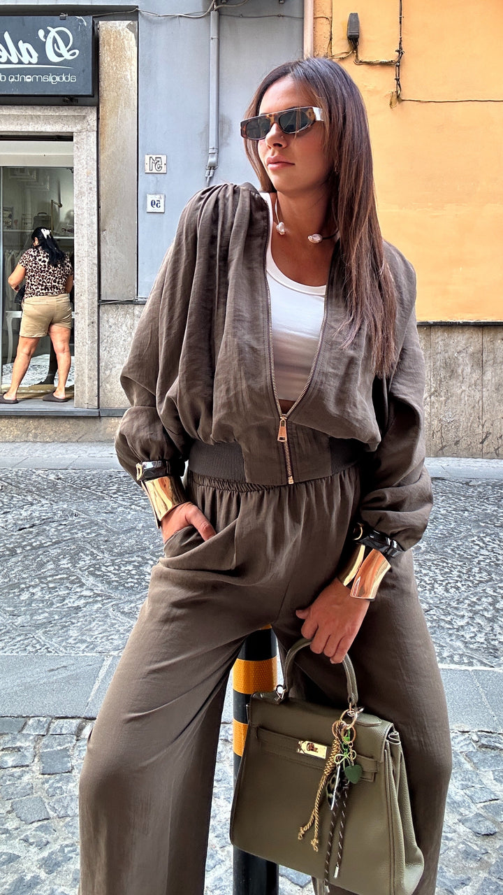 Giubbotto/giacca in tessuto Lyecell tessuto quasi del tutto naturale che ha la caratteristica oltre che a essere molto resistente è anche traspirante. Prodotto in Italia ha una Vestibilita quasi sartoriale e poi essere abbinato ai suoi pantaloni. Porta la una fascia elastica alla base che ci permette di ottenere un effetto bomber, stessa fascia che ritroviamo sui polsi e là zip sul davanti.
