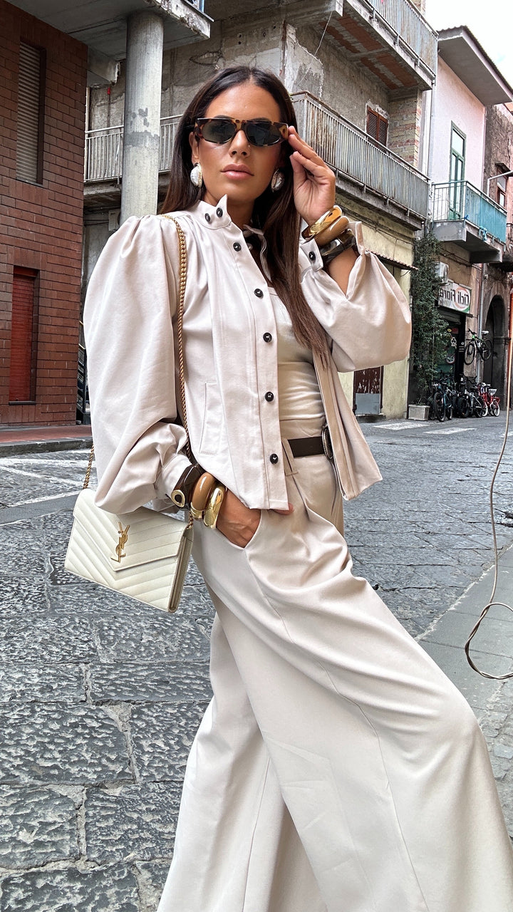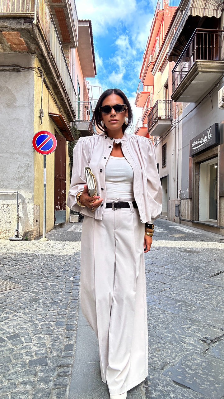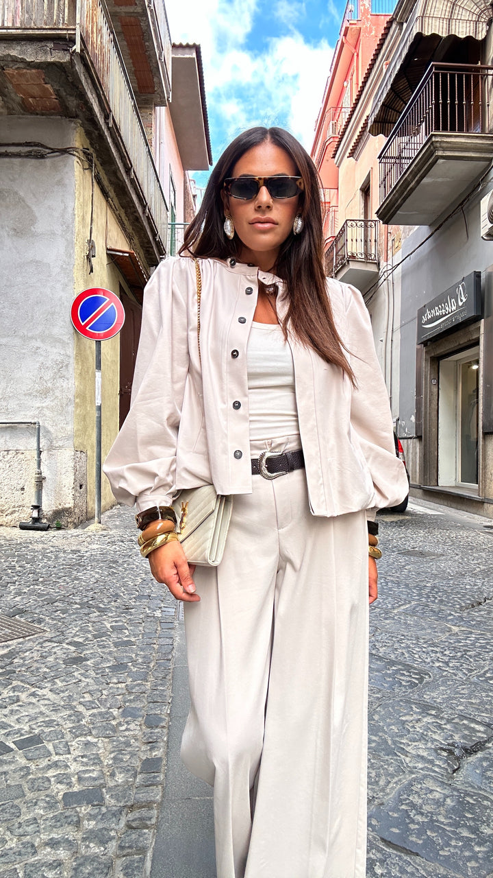 Giubbotto/giacca in tessuto Lyecell tessuto quasi del tutto naturale che ha la caratteristica oltre che a essere molto resistente è anche traspirante. Prodotto in Italia ha una Vestibilita quasi sartoriale e poi essere abbinato ai suoi pantaloni. Porta il collo alla coreana e i bottoni Sun davanti, scende a pieghe e rimane morbido