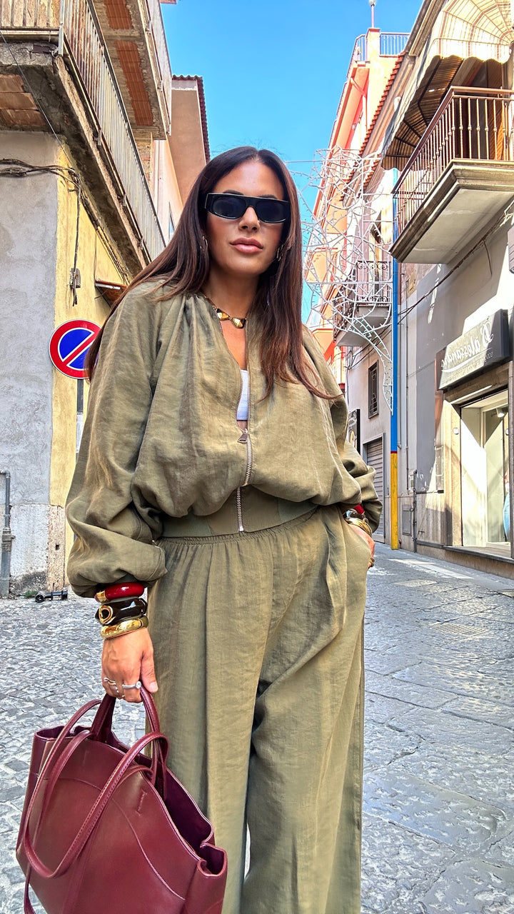 Giubbotto/giacca in tessuto Lyecell tessuto quasi del tutto naturale che ha la caratteristica oltre che a essere molto resistente è anche traspirante. Prodotto in Italia ha una Vestibilita quasi sartoriale e poi essere abbinato ai suoi pantaloni. Porta la una fascia elastica alla base che ci permette di ottenere un effetto bomber, stessa fascia che ritroviamo sui polsi e là zip sul davanti.