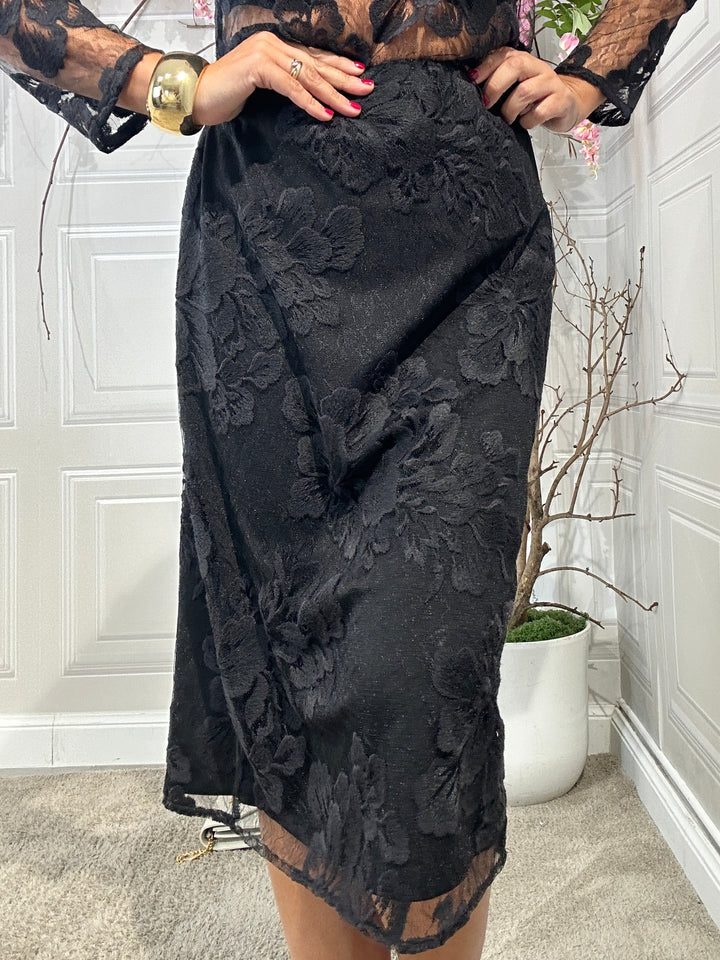 Gonna lunghezza sotto al ginocchio modello elastico, interamente foderata con velo sopra trasparente e ricamato tono su tono elastico in vita veste comoda