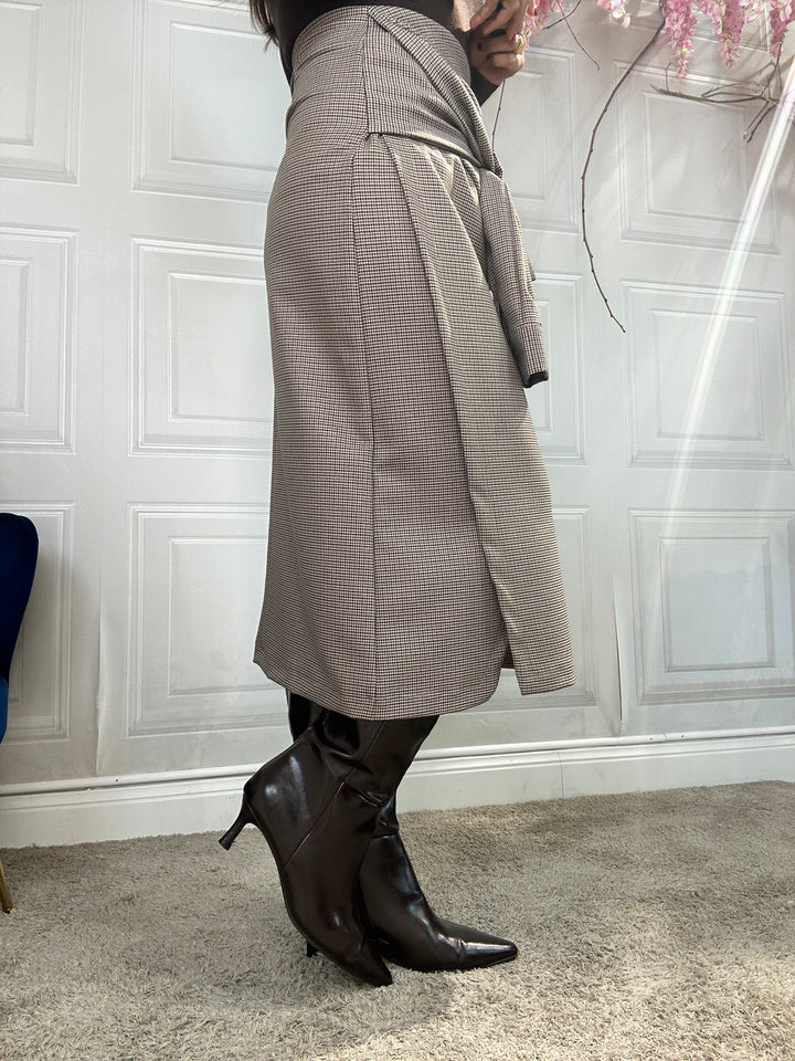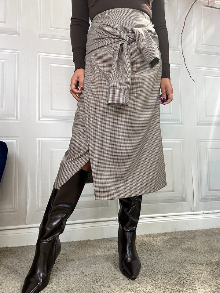 Gonna vita alta con cerniera sul retro porta una fusciacca in vita che sembrano maniche di una camicia. Ha lo spacco laterale. Veste fino alla taglia 46