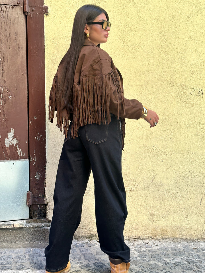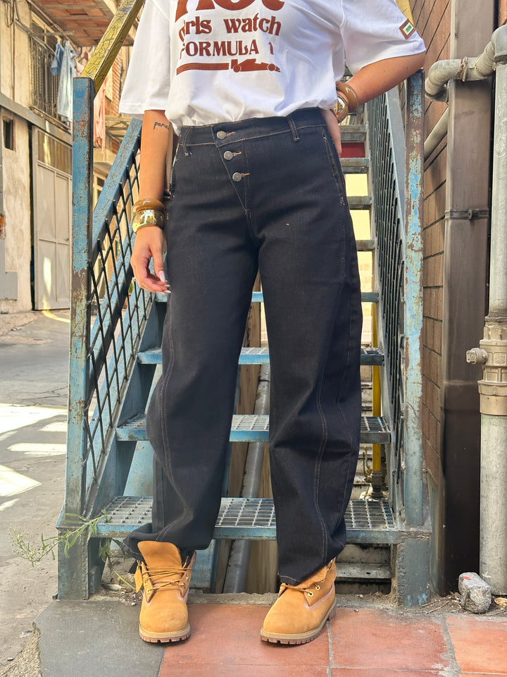 Jeans in Denim leggermente elastico con chiusura trasversale e cuciture in contrasto color camel. Vestibilita regolare