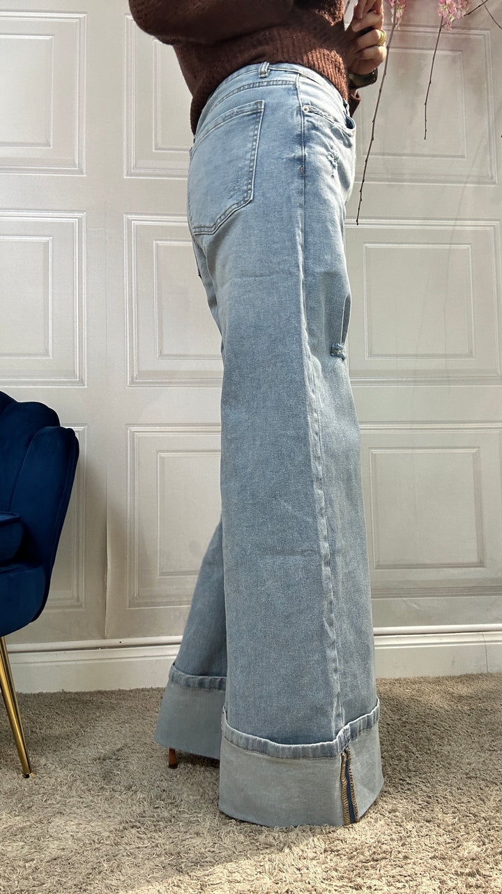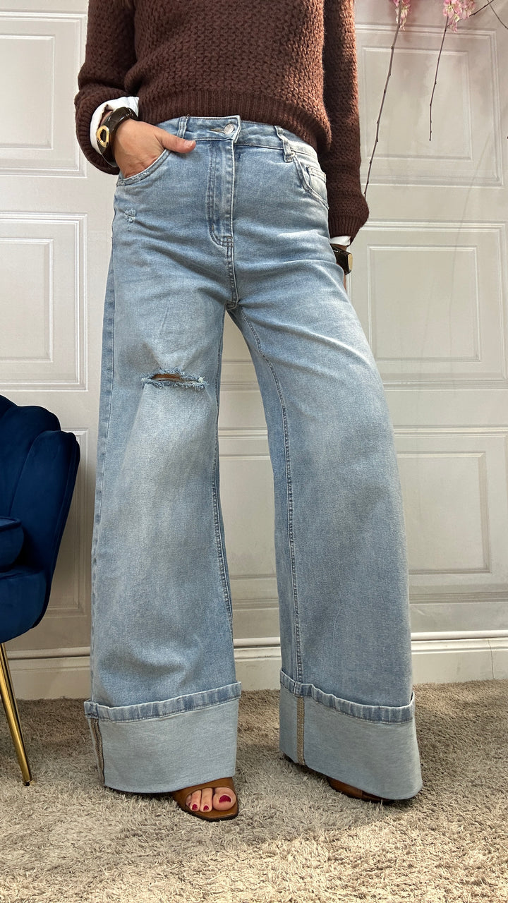 Jeans in Denim chiaro, tessuto fermo. Vita alta con bottone e zip centrale, tasche sul sabato e maxi piegone alla base. Vestibilita regolare
