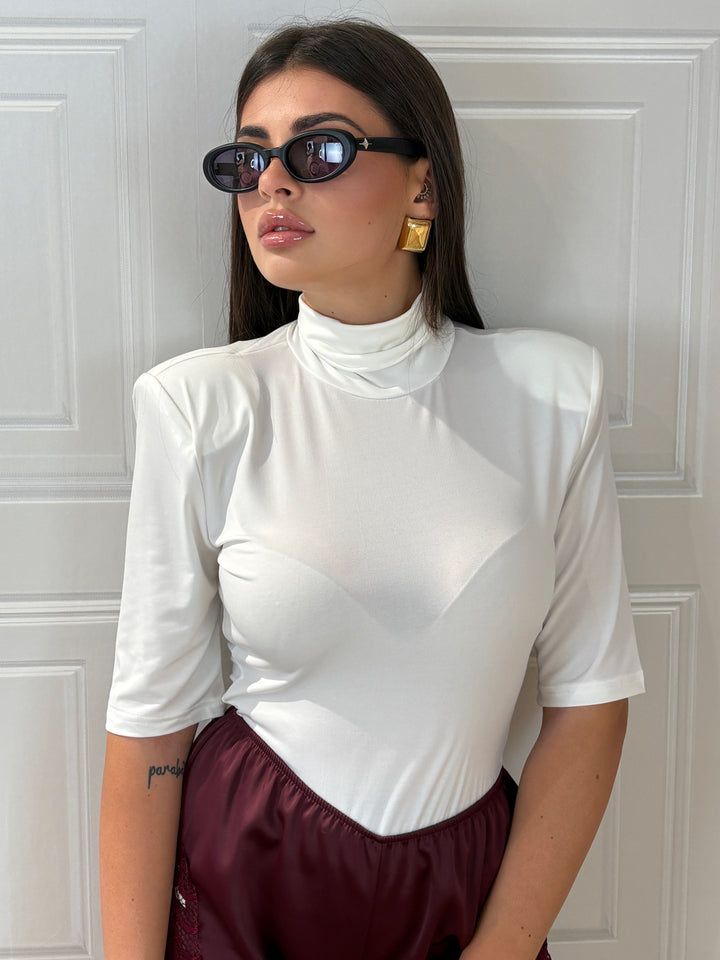 Maglia a body in lycra con collo alto morbido e spalline imbottite. Lunghezza manica sopra al gomito.
