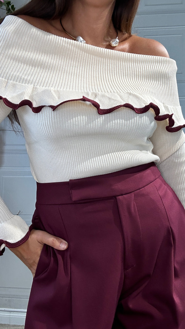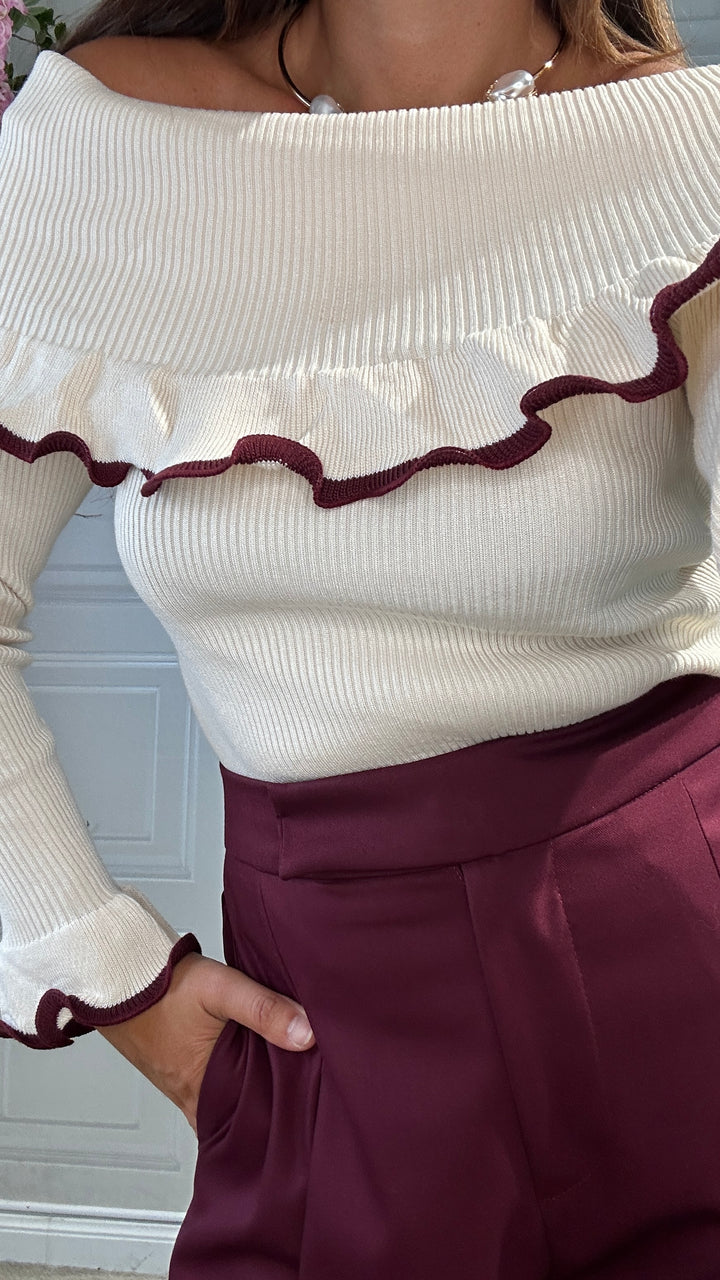 Maglia in filo a costine, con scollatura a barca e bordo in contrasto sulla manica e sulla bordo dello scollo