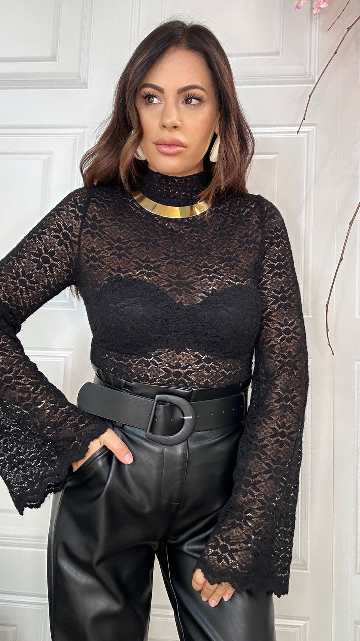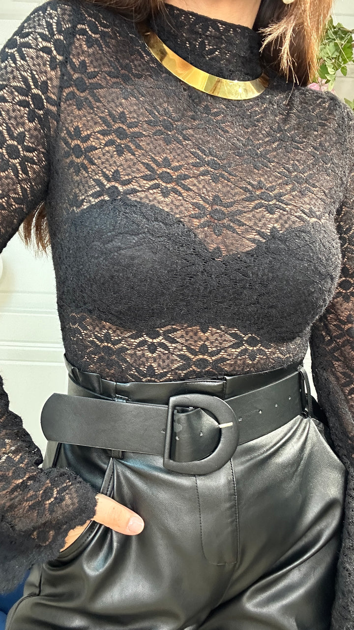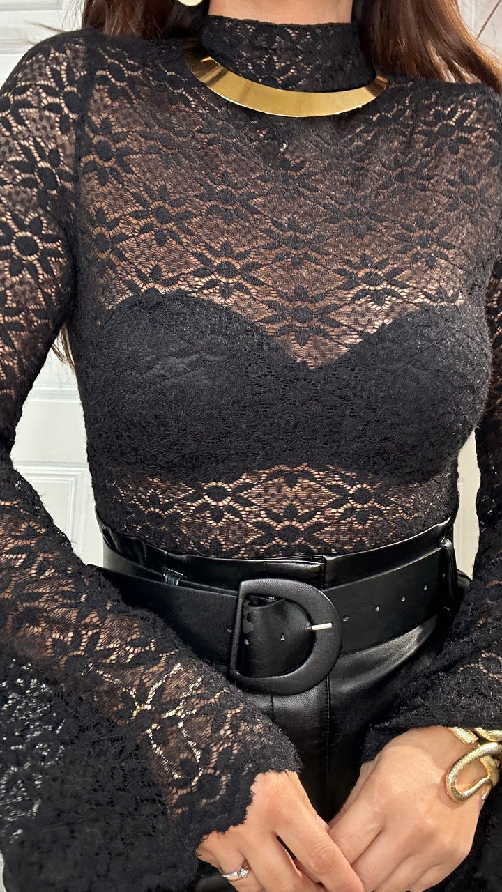 Maglia interamene in merletto trasparente,mezzo collo e manica lunga ampia  modello slim il tessuto e in poliammide