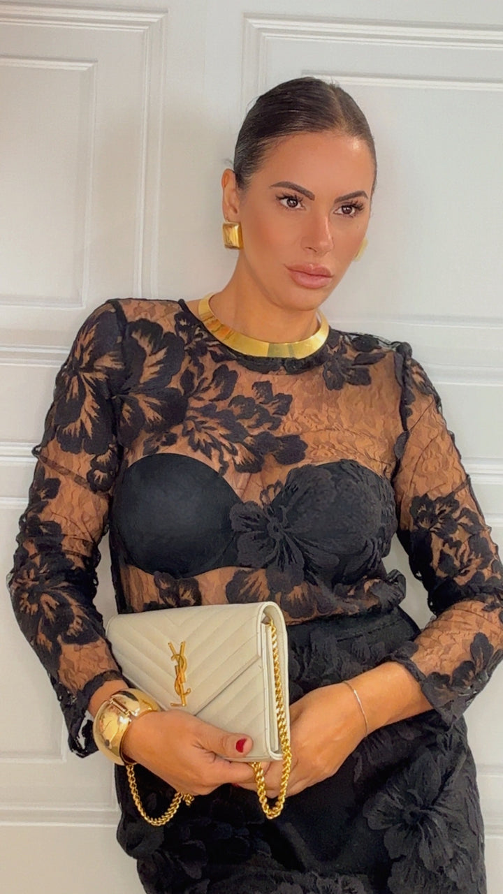 Maglia completamente trasparente con ricami in merletto tono su tono lunghezza regolare, girocollo eani a lunga