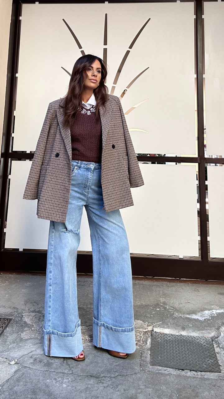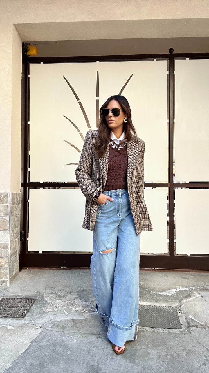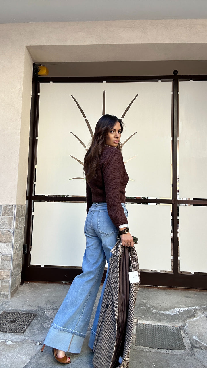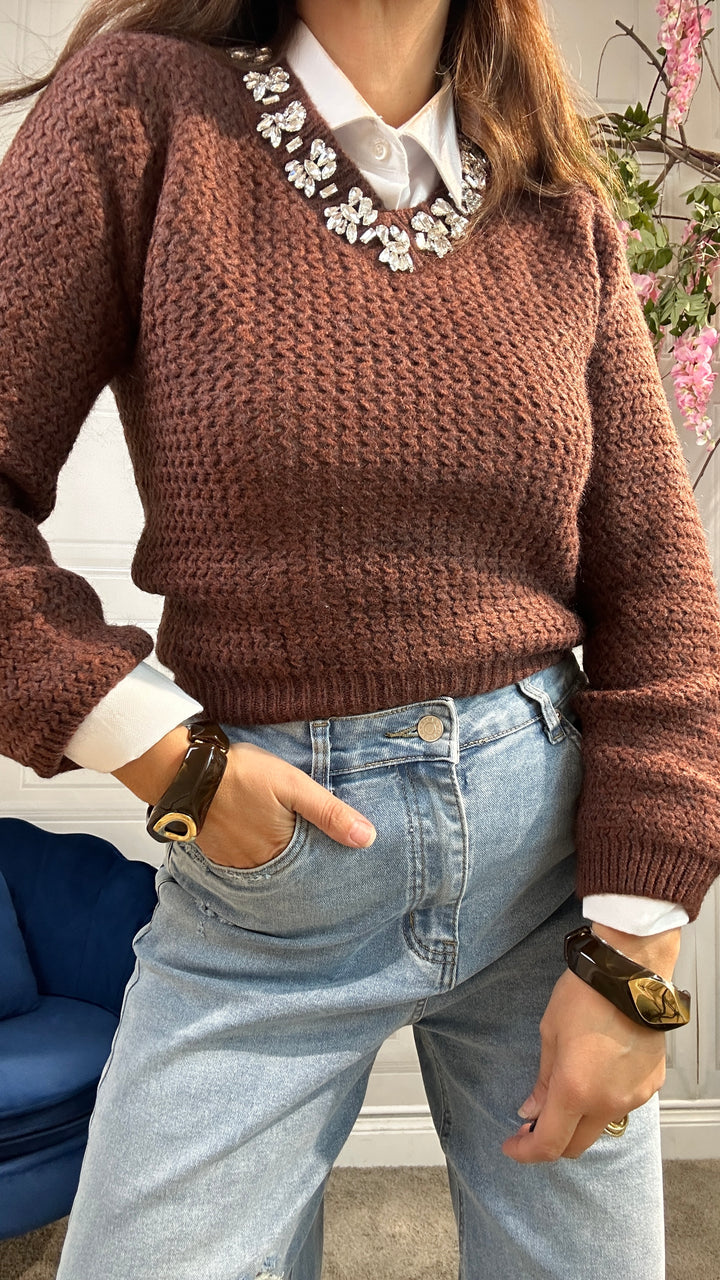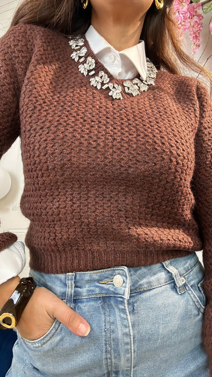 Maglioncino in lana con scollatura a punta e dettaglio di pietre cucite si base argento. Taglia unica veste fino alla taglia 46