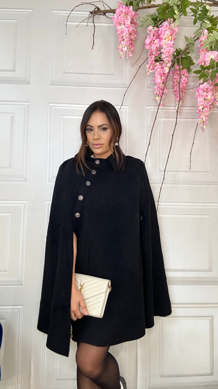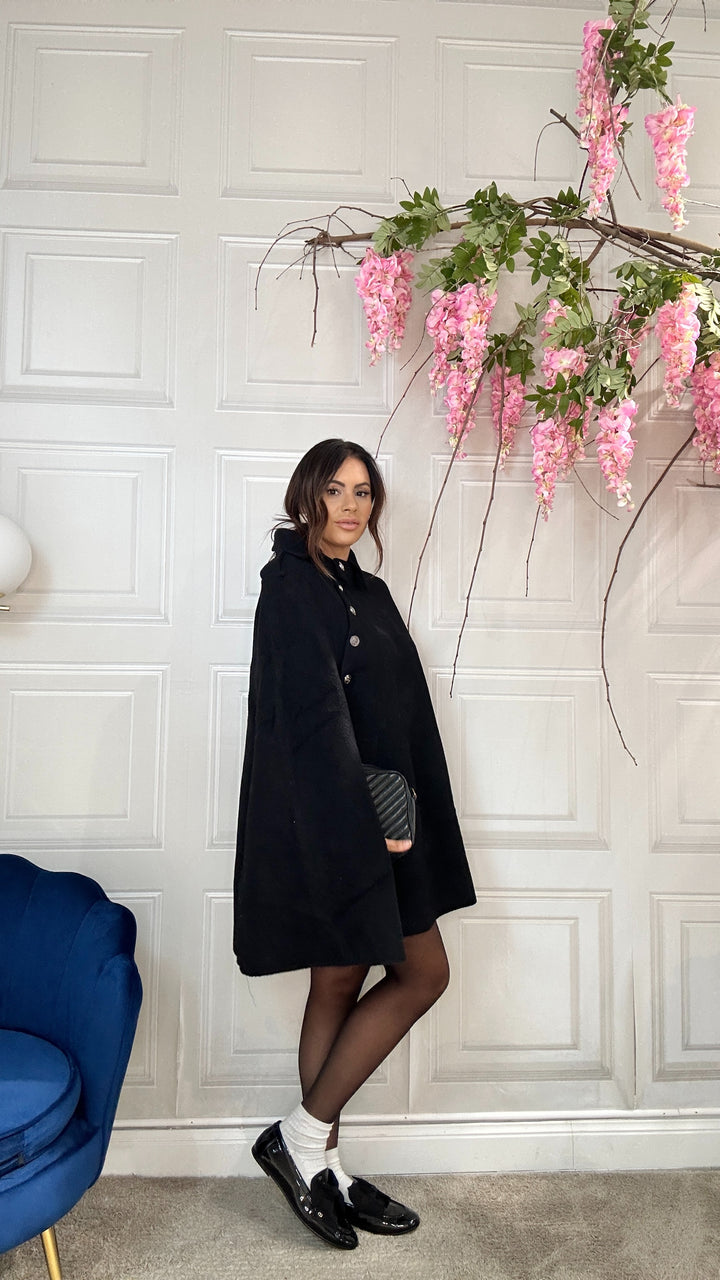 Mantella in lana fantasia piede de poul ha l’abbottonatura laterale. Veste fino alla 48
