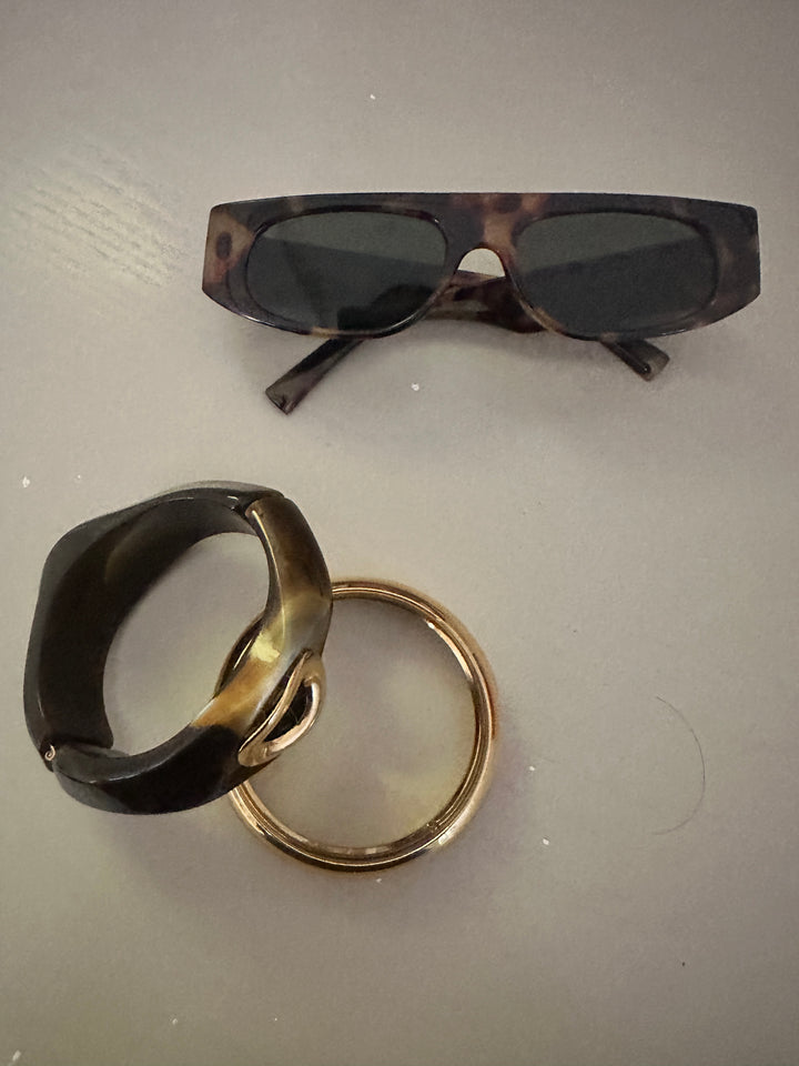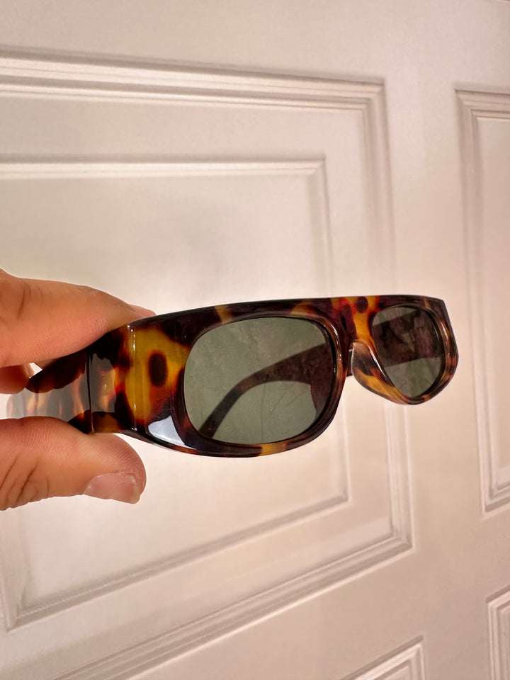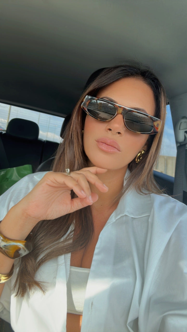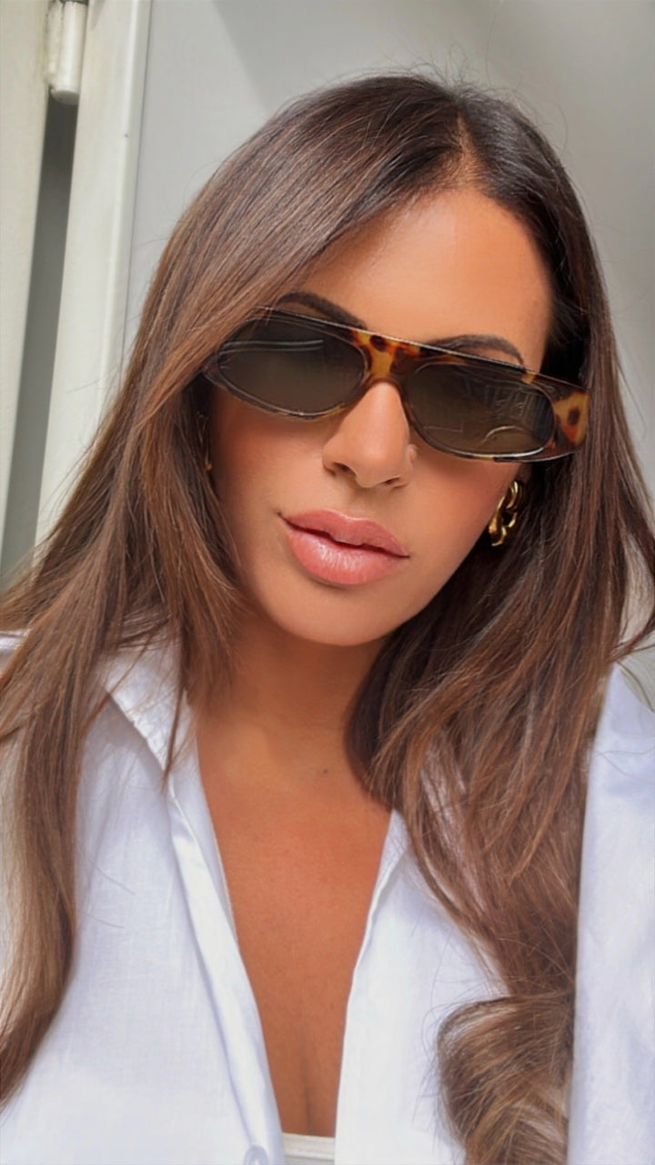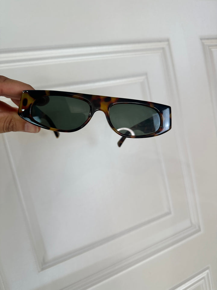 Gli occhiali hanno un design elegante e moderno, con una montatura che presenta un motivo tartarugato. Le lenti sono scure, offrendo una protezione efficace dal sole. La forma è affusolata, che si adatta bene al viso e aggiunge un tocco di stile sofisticato. Questi occhiali possono essere abbinati a vari outfit, rendendoli un accessorio versatile e chic.