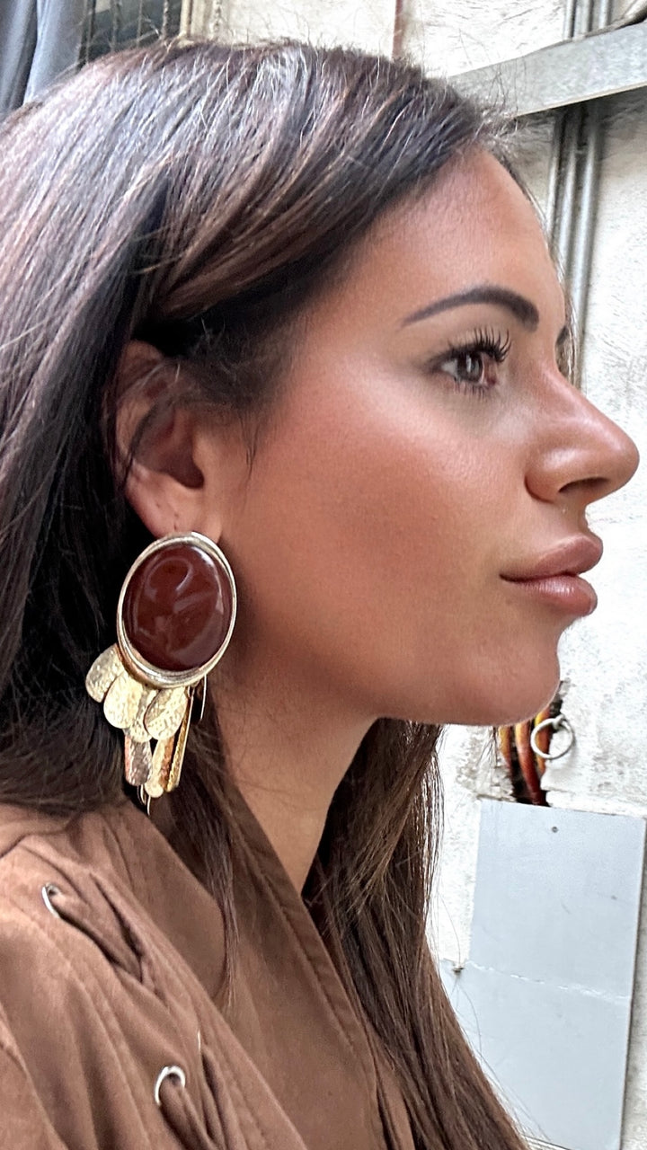 Orecchini con pietra smaltata marrone su base ore e ciondoli oro.