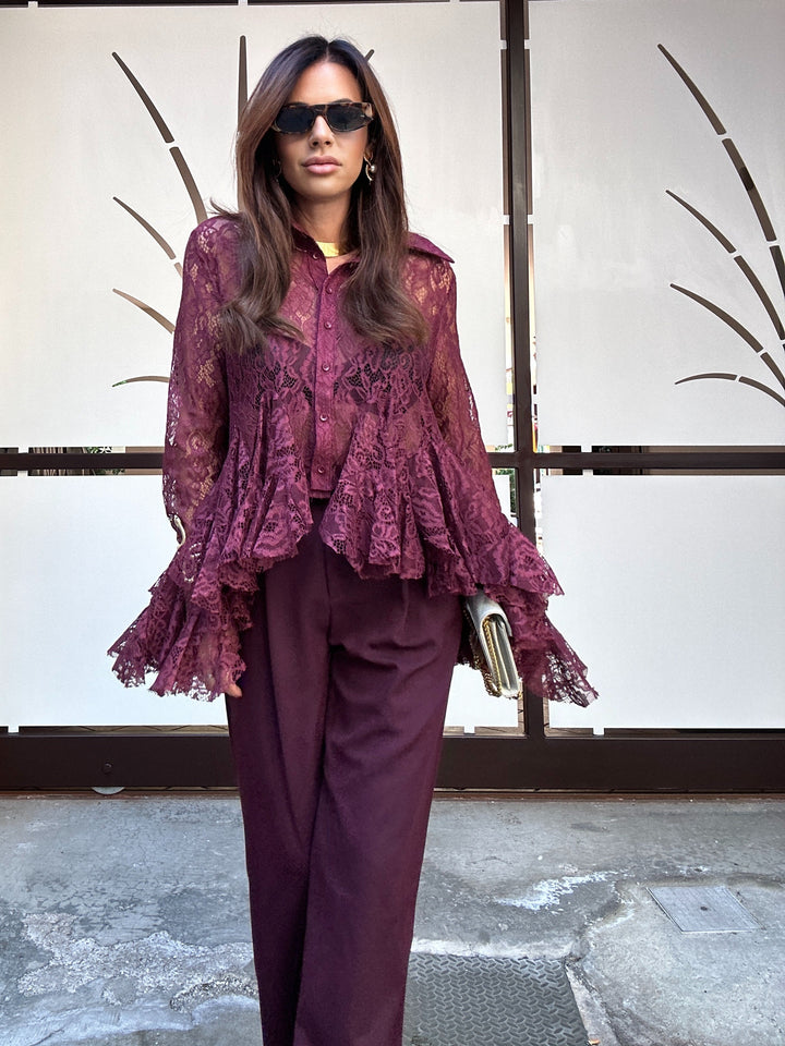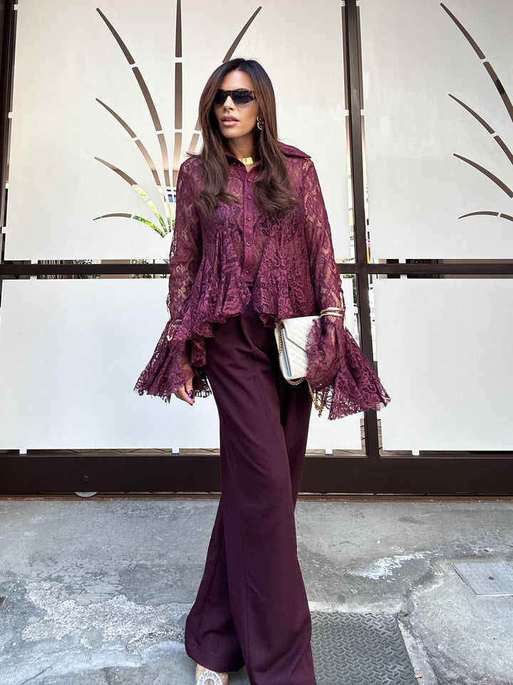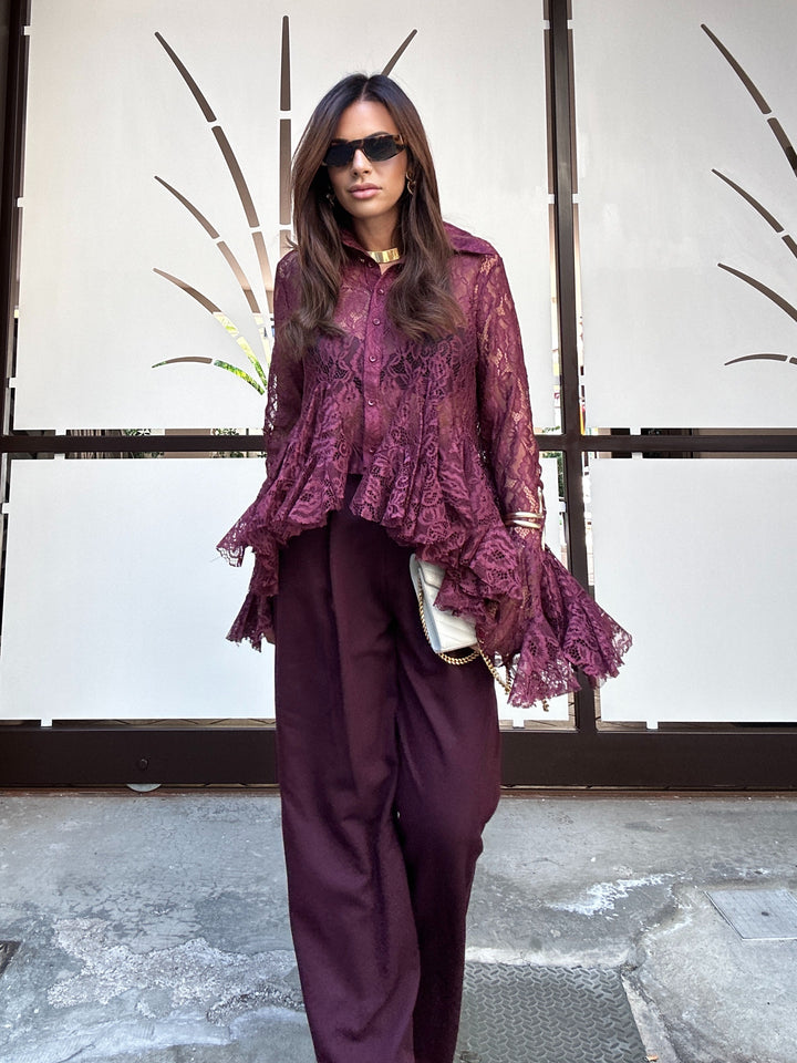 Pantalone modello palazzo con bottone rivestimento leggermente sul lato tasche sui fianchi e pencie sul davanti