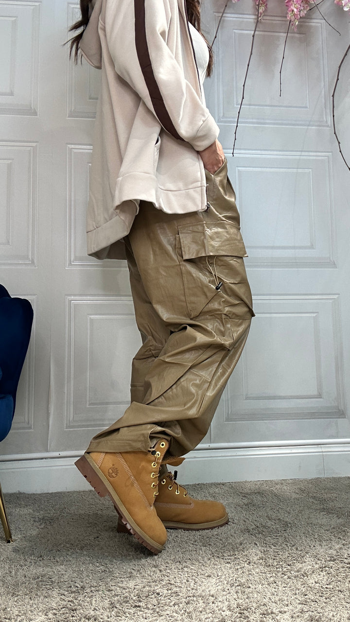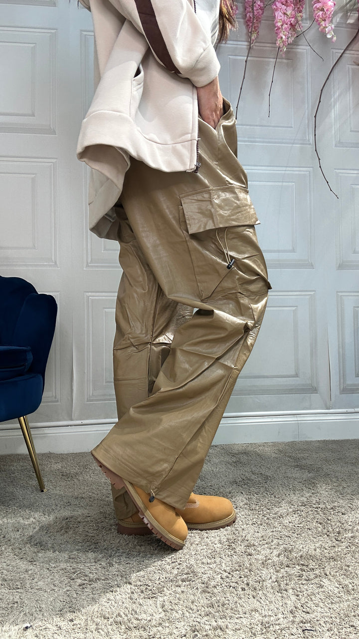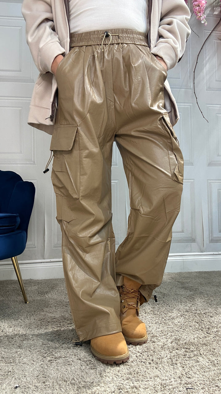 Pantaloni cargo in simil pelle con molla elastica in vita. Coulisse che ci permette di valorizzare il punto vita. Tasche laterali e tasconi sempre laterali. La coulisse la troviamo anche alla base. Vestibilita over