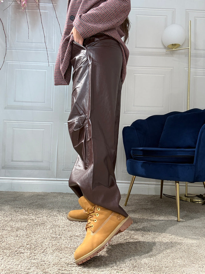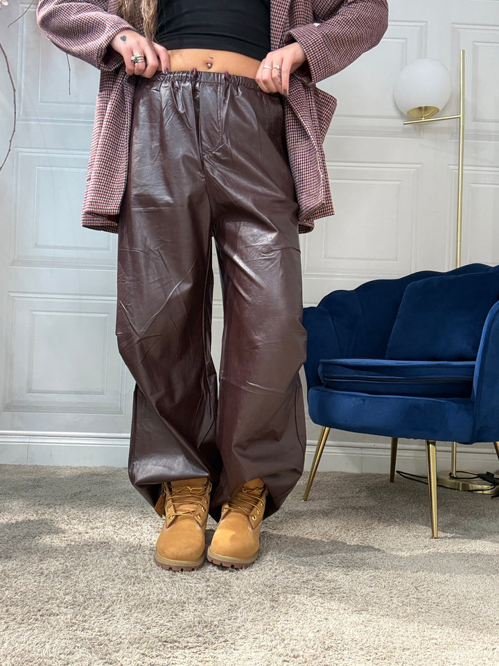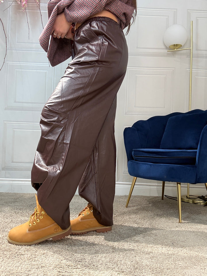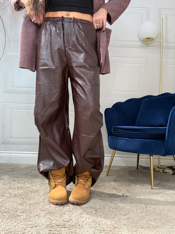 Pantaloni cargo in simil pelle con molla elastica in vita. Coulisse che ci permette di valorizzare il punto vita. Tasche laterali e tasconi sempre laterali. La coulisse la troviamo anche alla base. Vestibilita over
