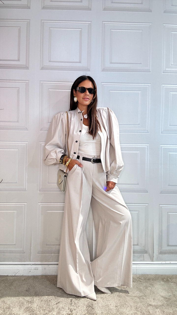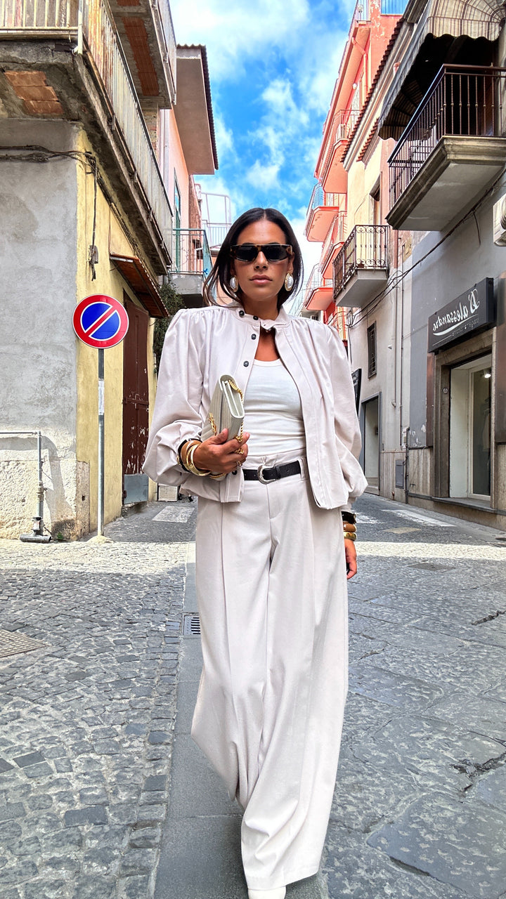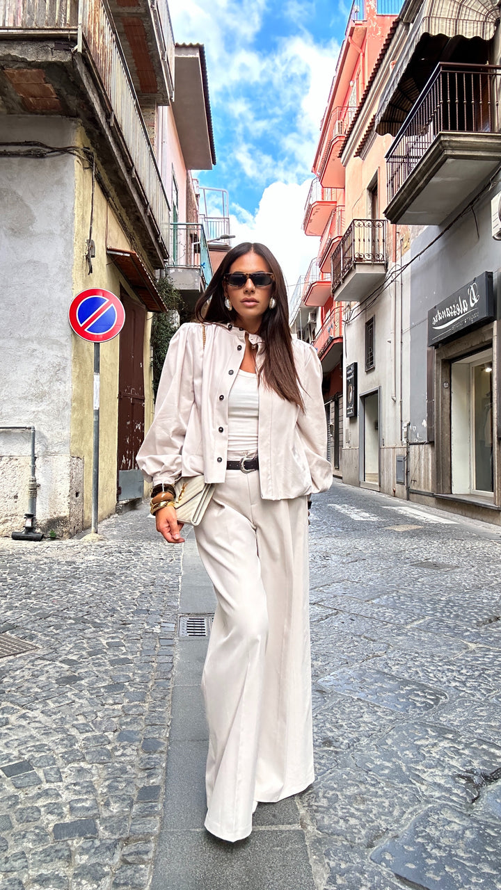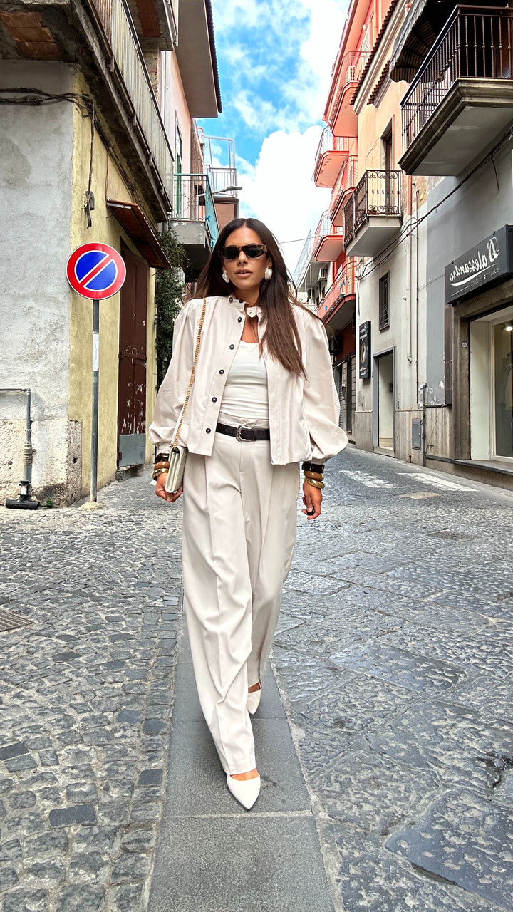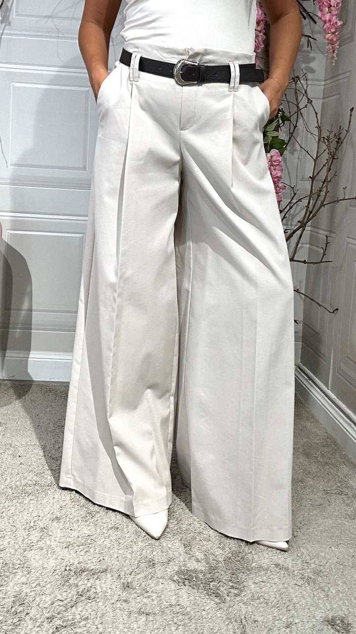 sono vita alta con zip centrale e gancetto invisibile. Porta una cintura che ovviamente è removibile. Ha le pence e scenda largo di gamba