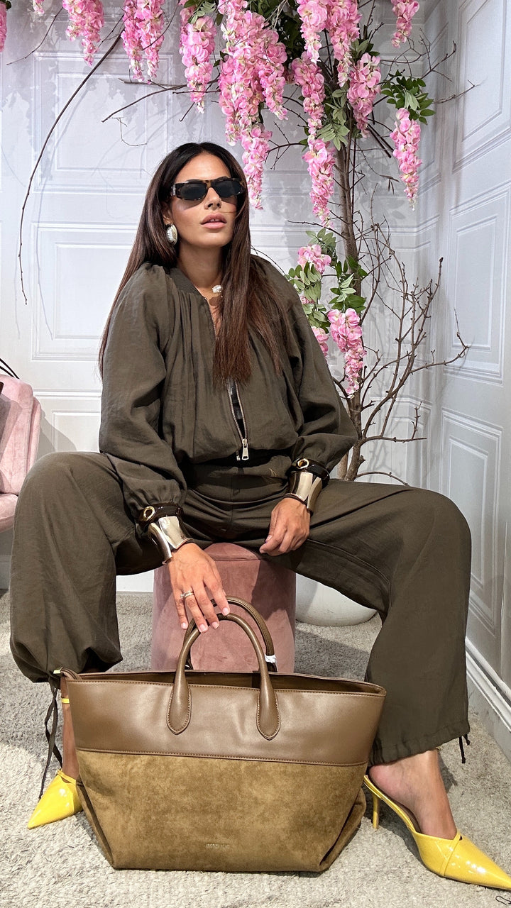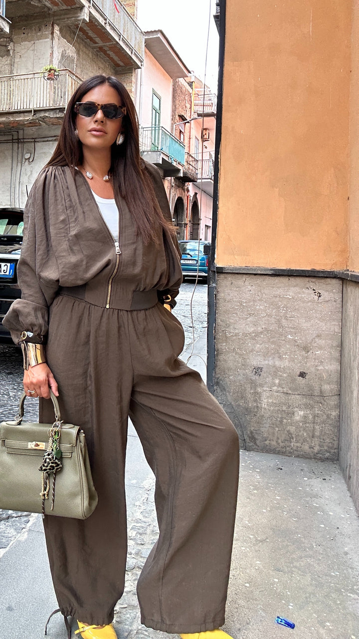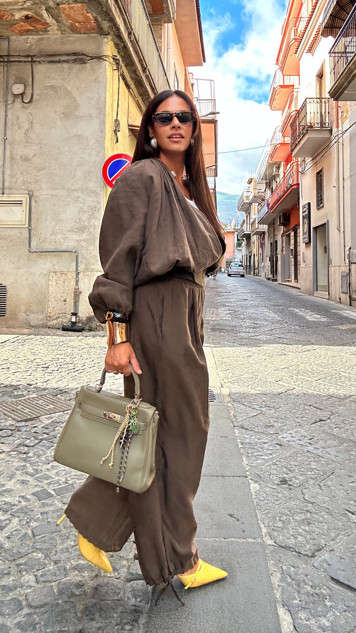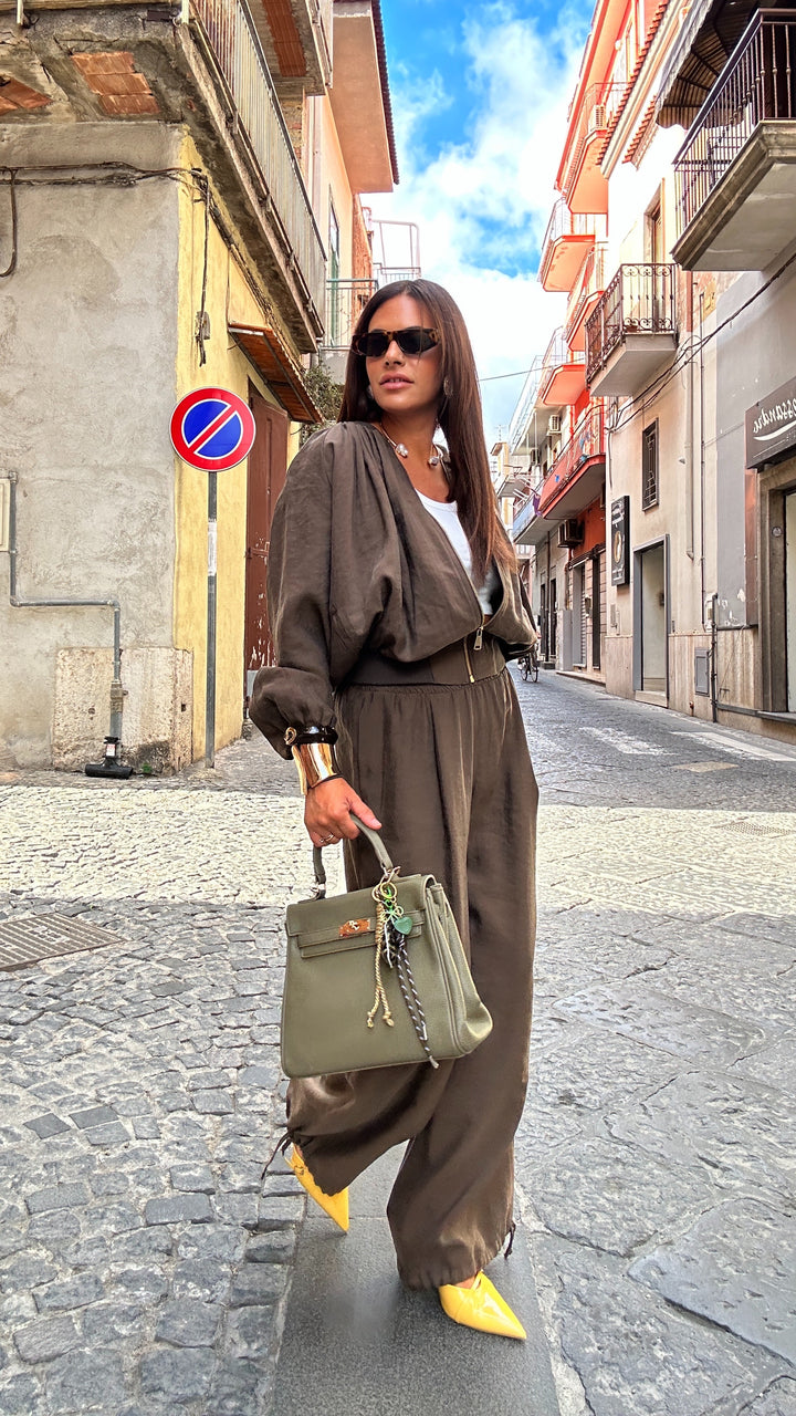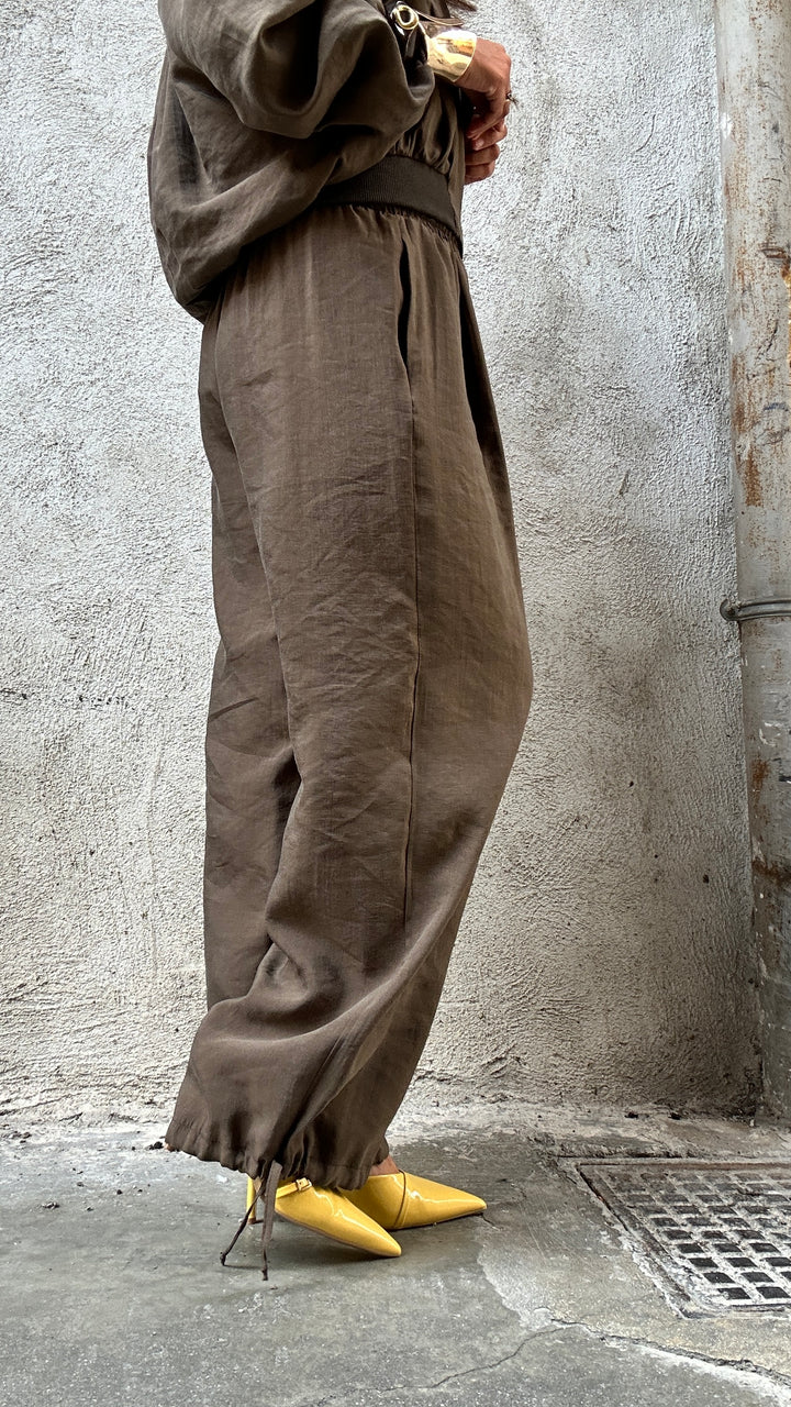 sono vita alta con molla elastica in vita, tasche laterali e coulisse alla base che vi permettete di poterlo stringere alla caviglia