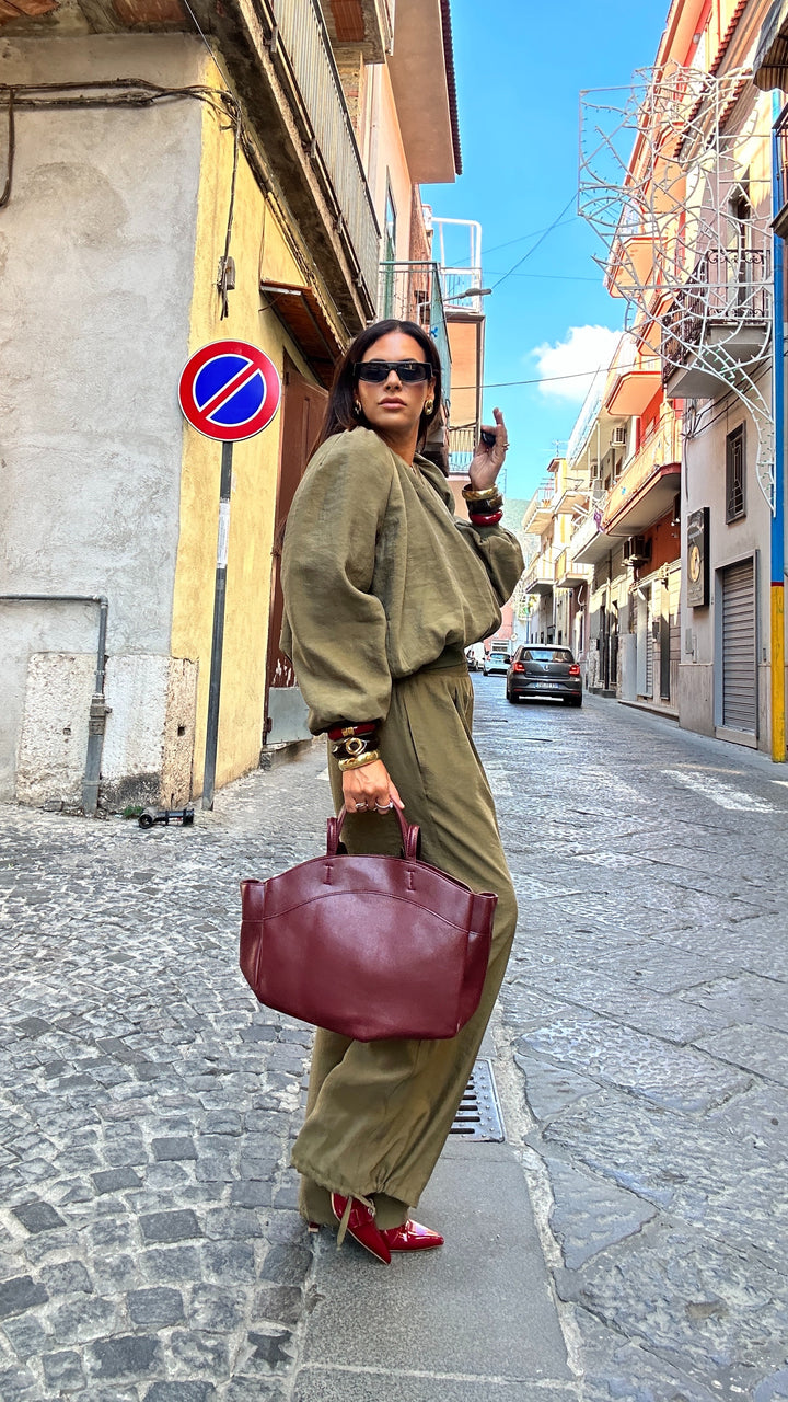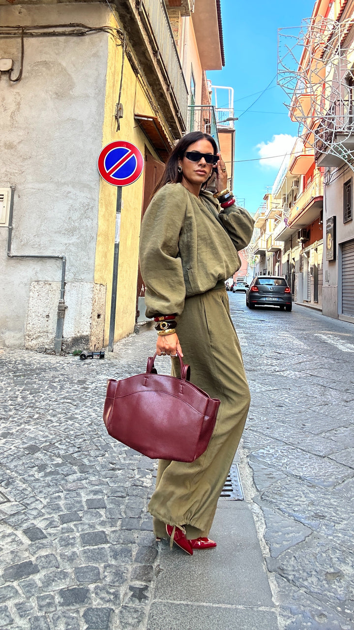 sono vita alta con molla elastica in vita, tasche laterali e coulisse alla base che vi permettete di poterlo stringere alla caviglia