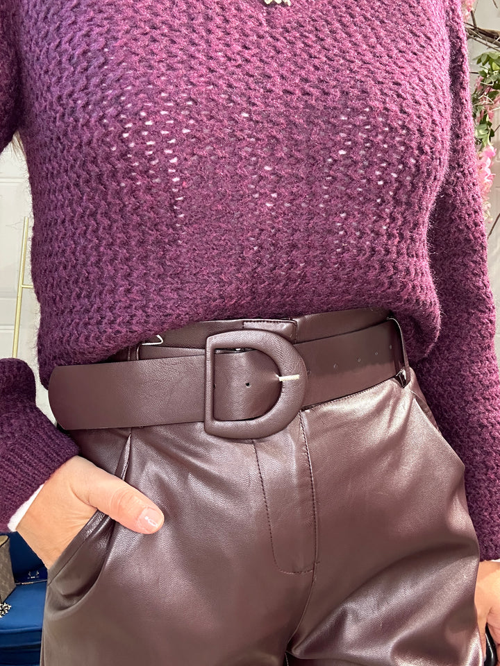 Pantalone in ecopelle alto in vita con elastico e cinturone, scende a sigaretta quindi nn largo la chiusura nn porta il bottone ma la cerniera lunga,pencie sui fianchi e la lunghezza e alla caviglia la vestibilità e regolare