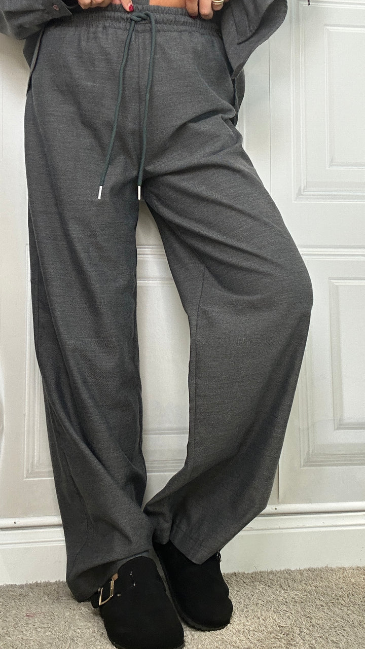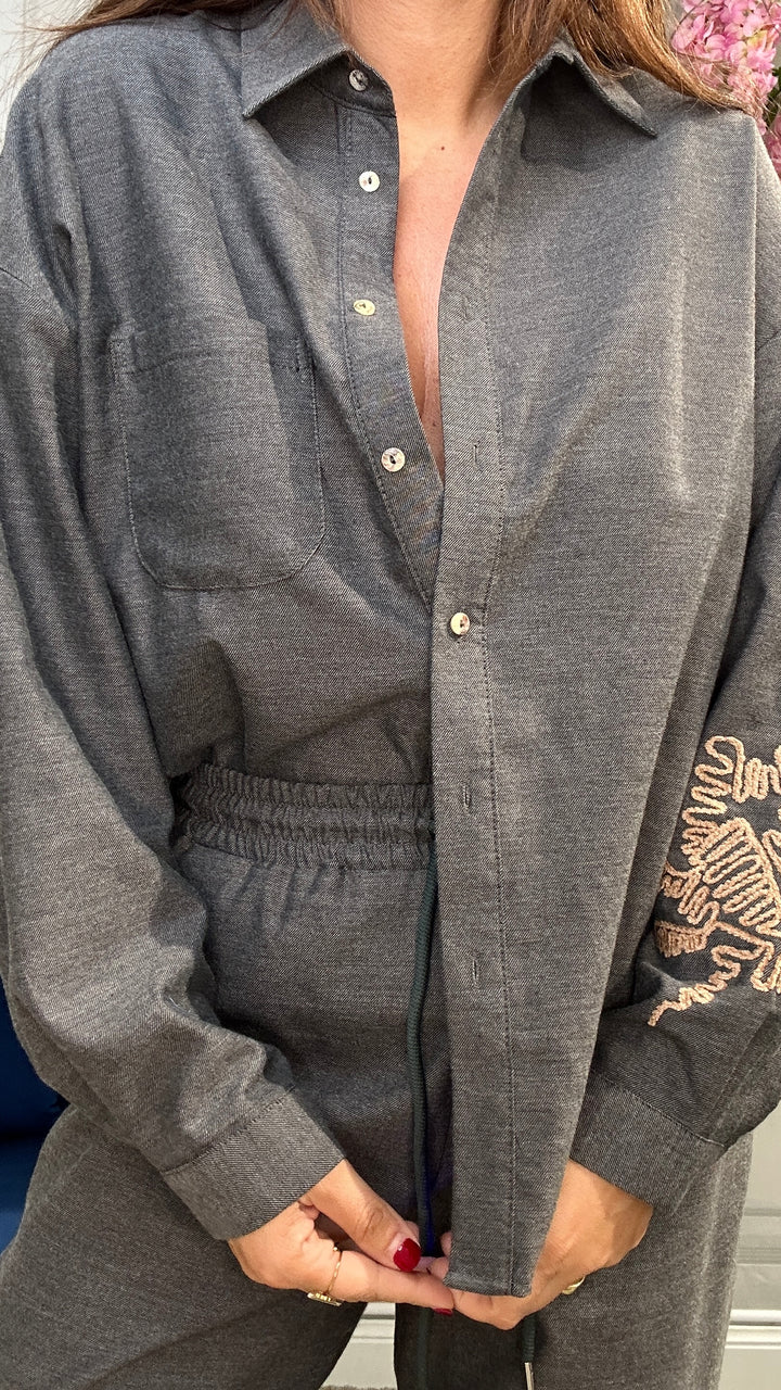 Coordinato ideato e prodotto in Italia, il suo tessuto è eccellente. 35% cotone caldo. Composto ca camicia over con tagli laterali. Pantaloni con coulisse in vita che valorizza il punto vita e gamba larga. Le taglie disponibili sono S M L.