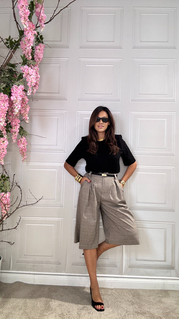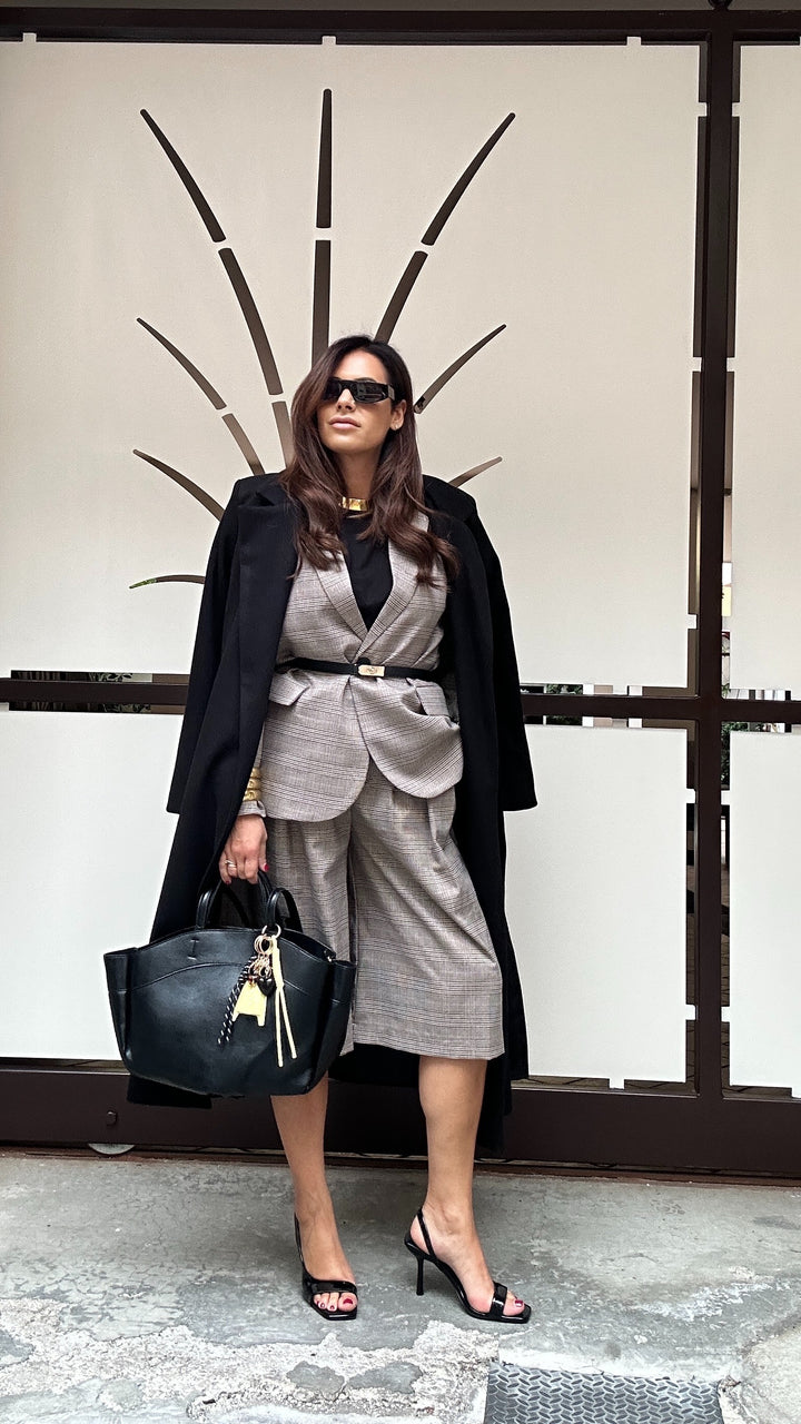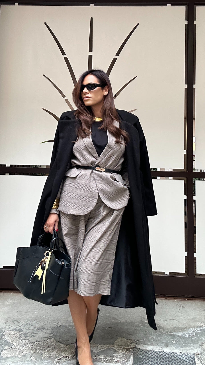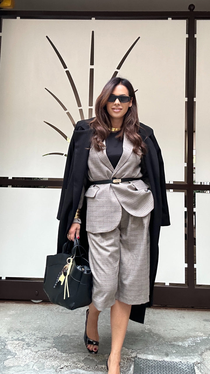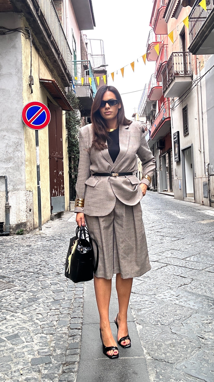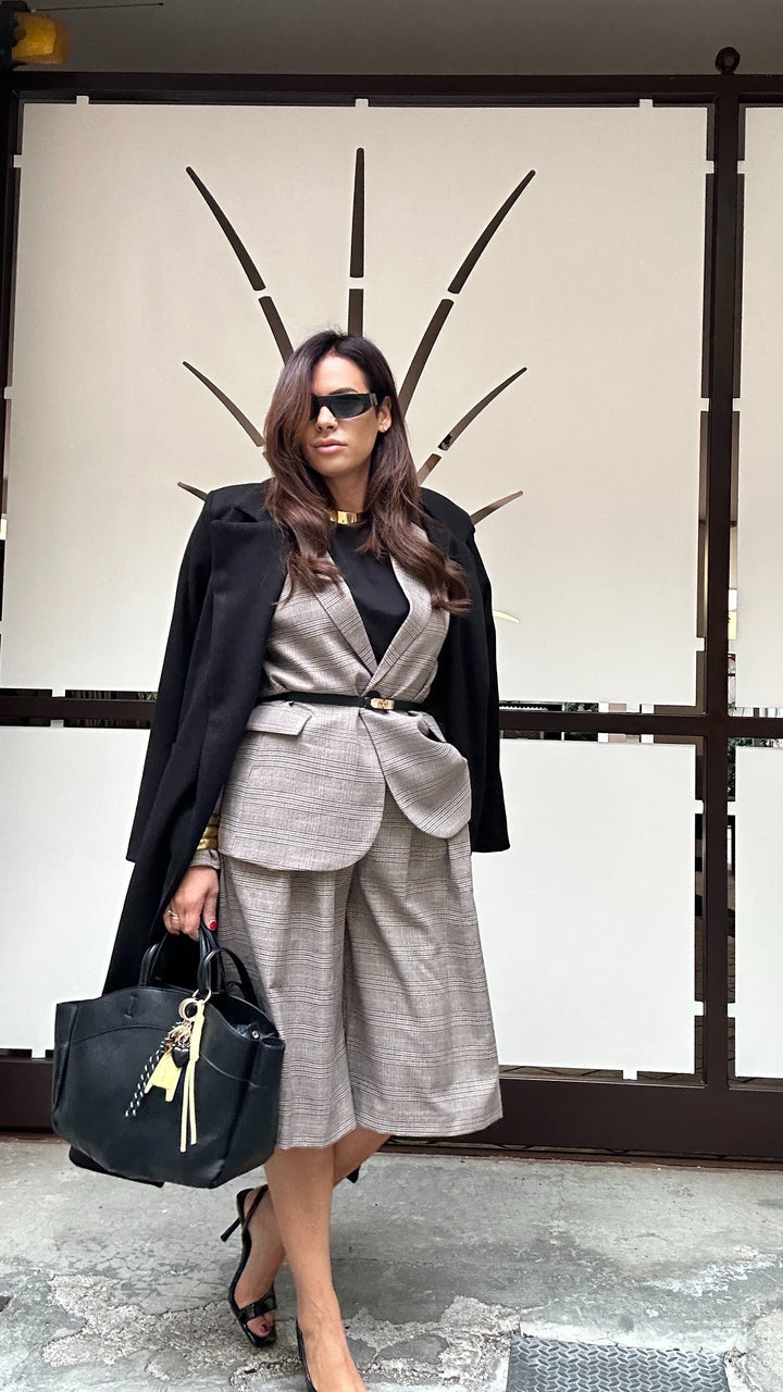 Tailleur composto d giacca e bermuda,tg unica ,la giacca e modello over con spalline strutturate all'interno un bottone centrale ed e compresa di spilla,bermuda taglia unica con bottone centrale e pencie e tasche sui fianchi scende largo a palazzo