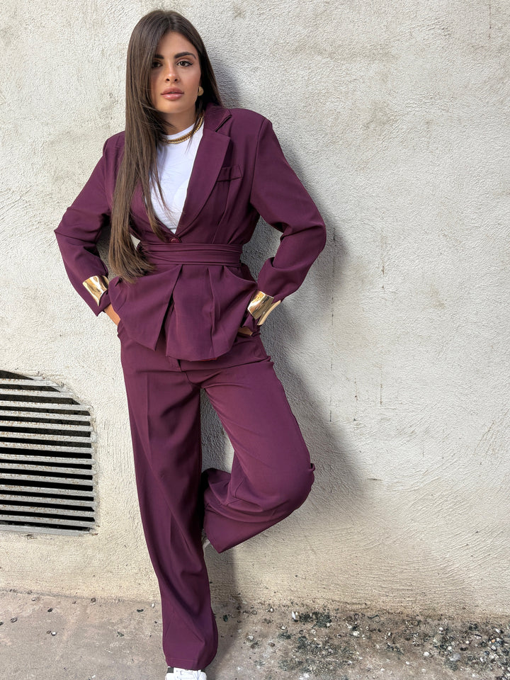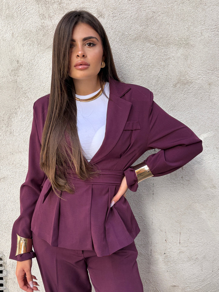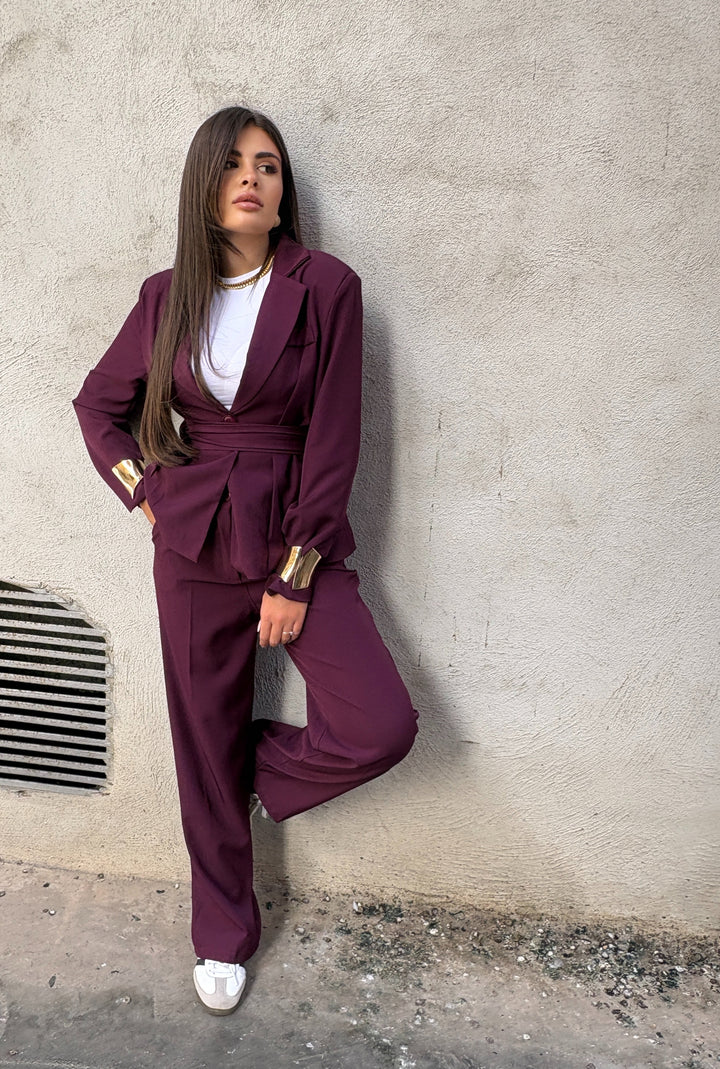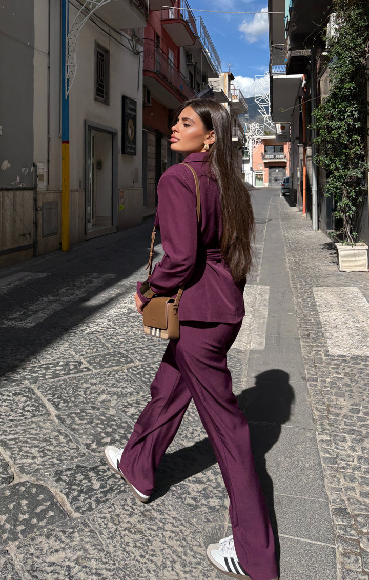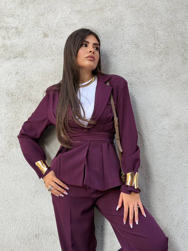 Tailleur low cost composto da giacca più avvitata al centro, quindi otteniamo un effetto a campana. Bottone centrale e spallina interna. Pantaloni vita alta con bottone e cerniera centrale, tasche laterali. Veste fino alla taglia 46