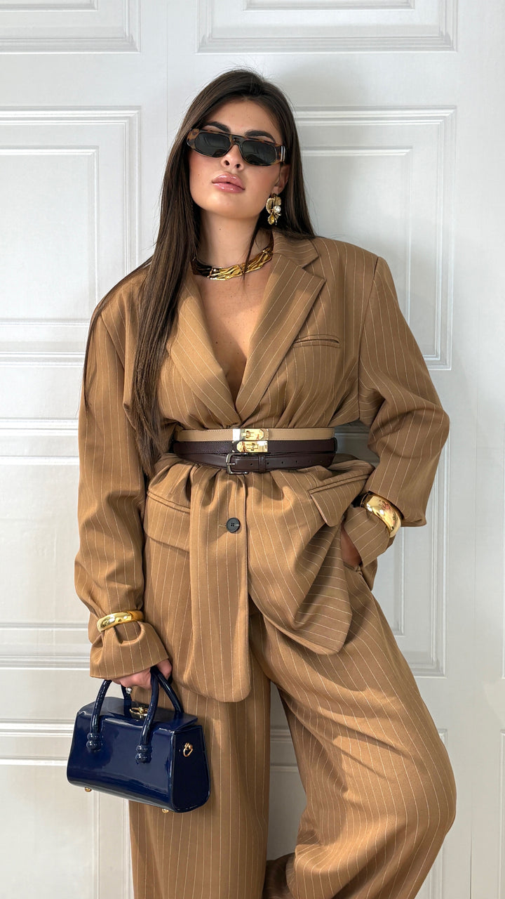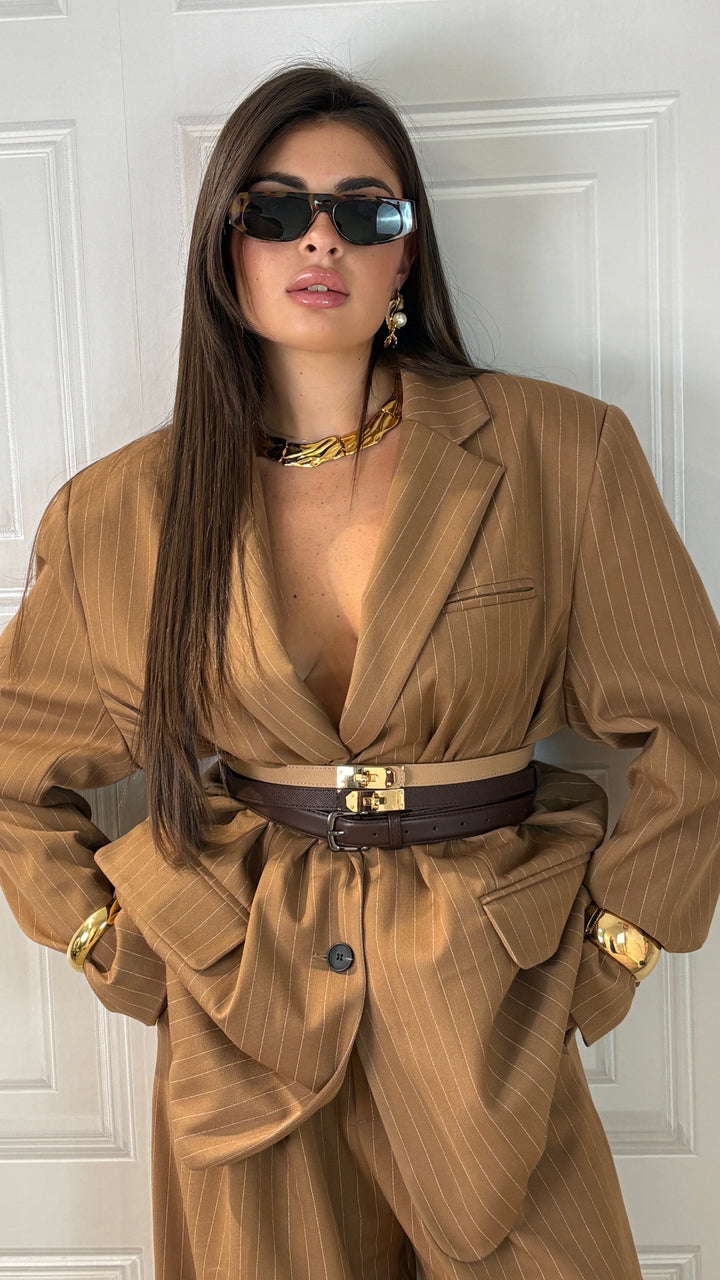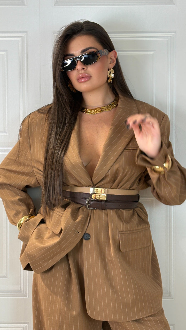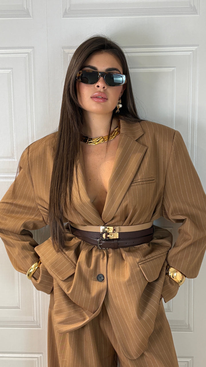 È uno spettacolo questo tailleur di Lumina.un capo davvero versatile. Adatto sia di giorno che di per un evento serale. La giacca è over con la spallina interna e doppio bottone sul davanti. Porta anche una cintura in simil