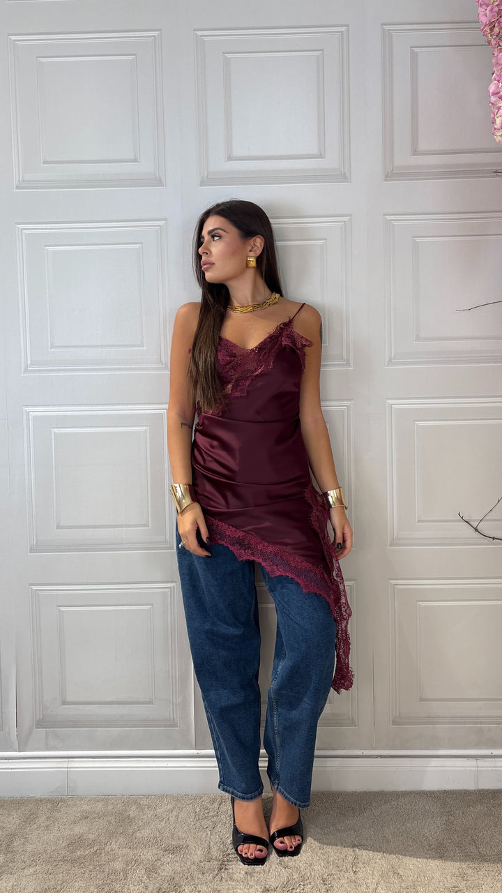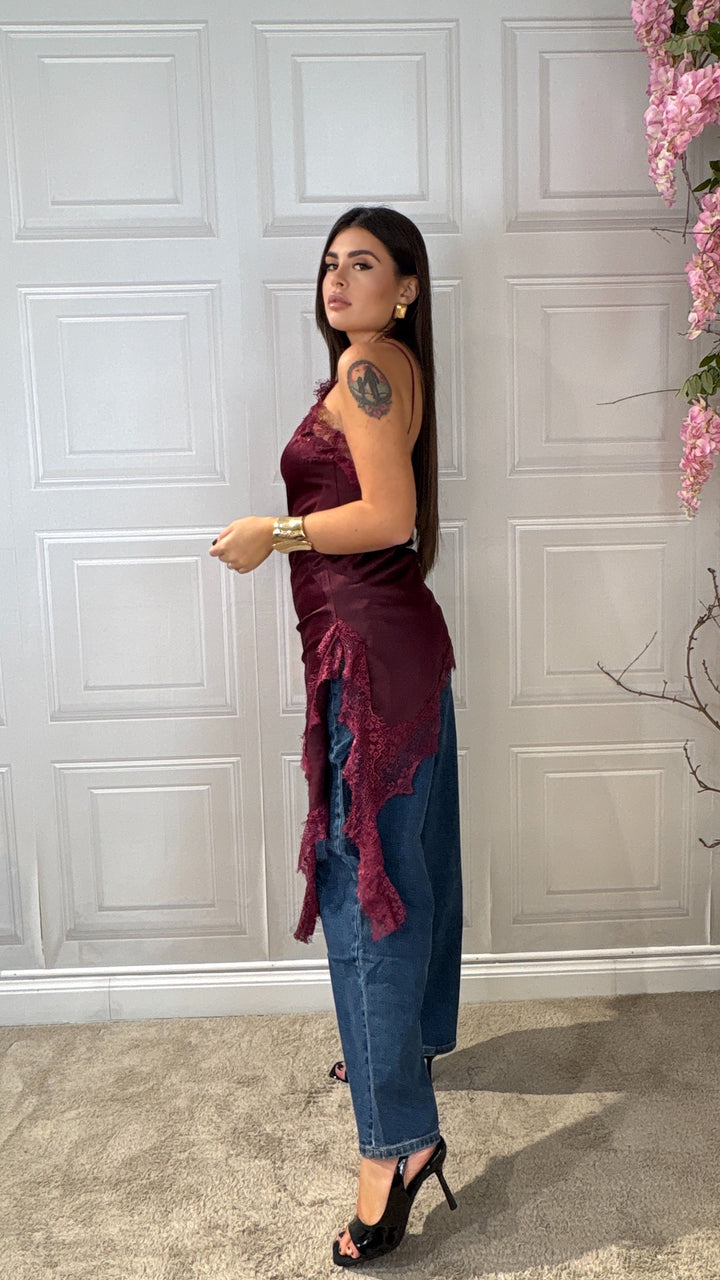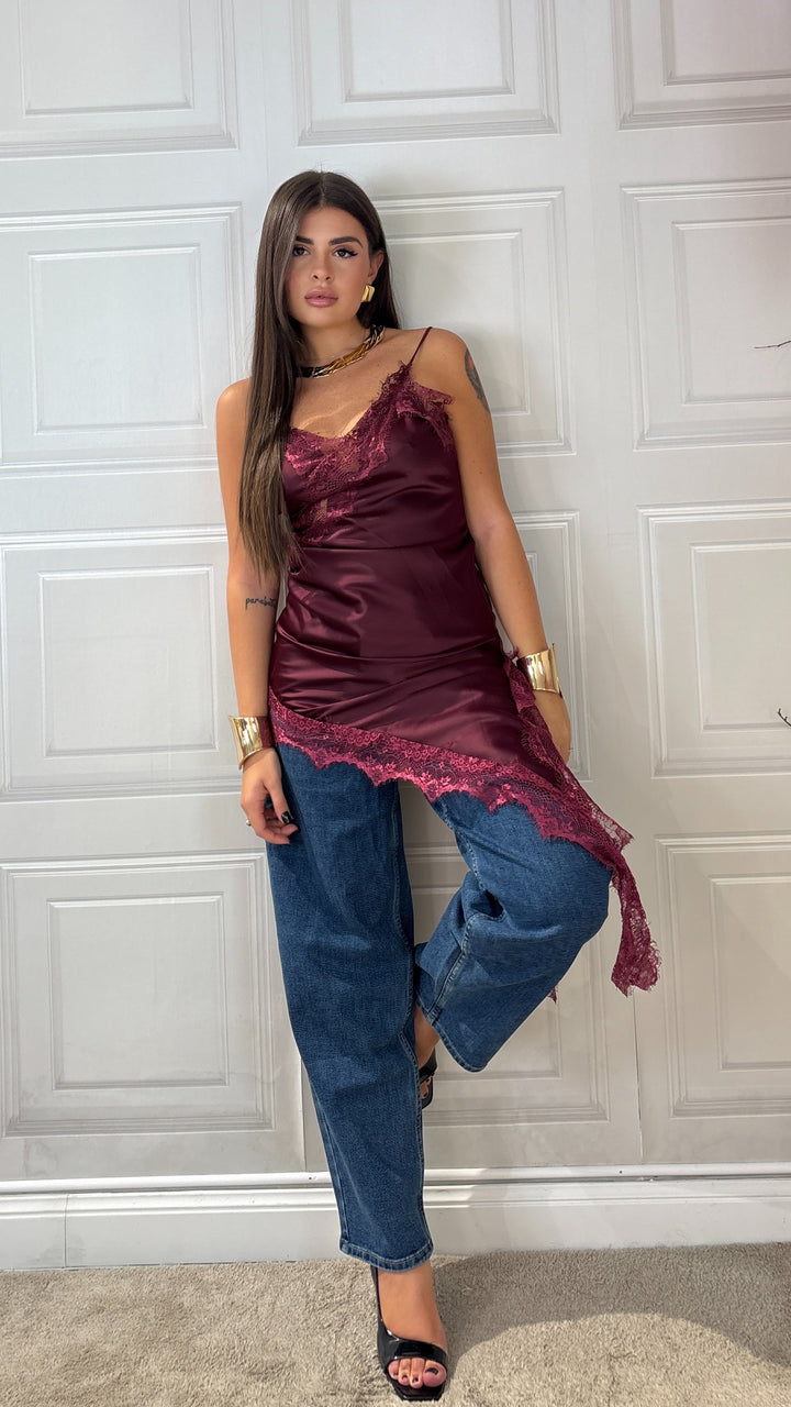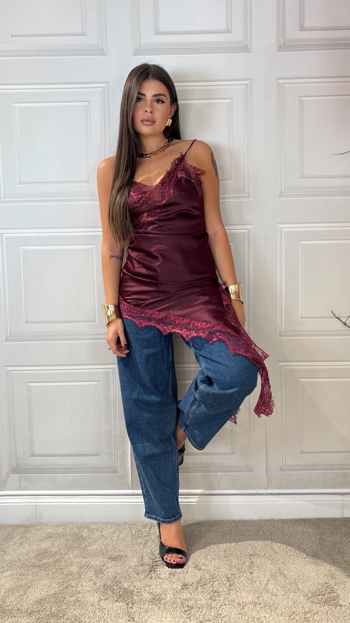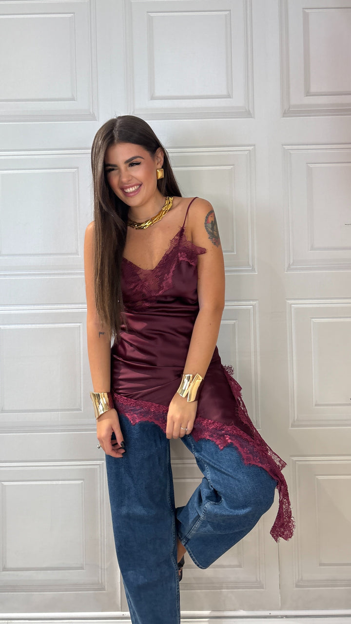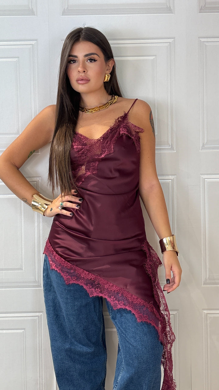 Top Effetto raso con bretelle lungo abbastanza da poterlo mettere anche a dress ha un taglio trasversale e porta il merletto sul seno e sul bordo