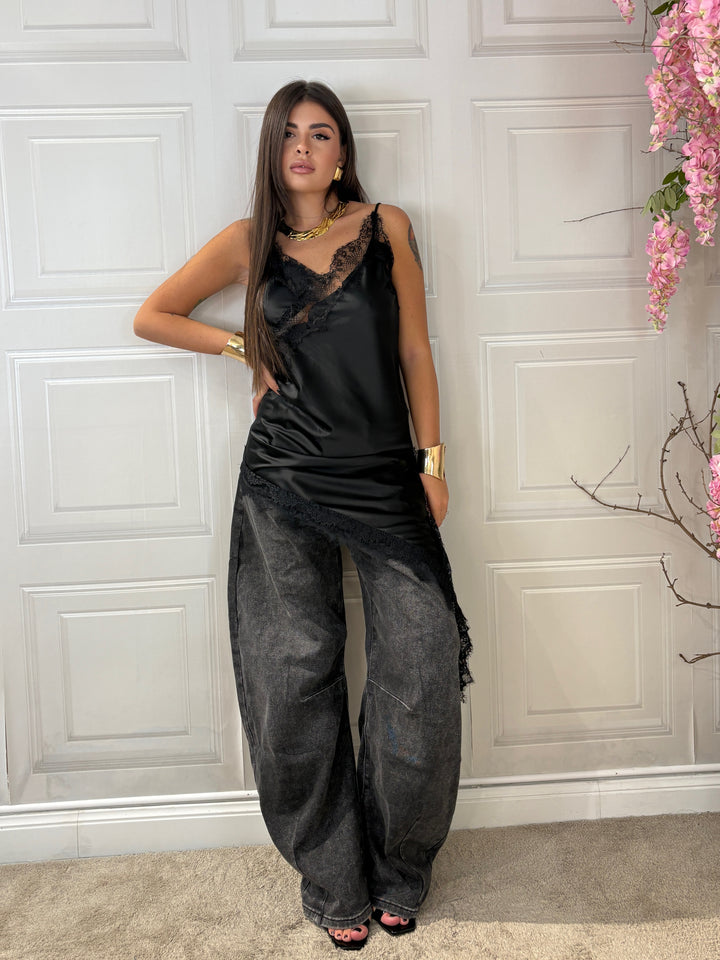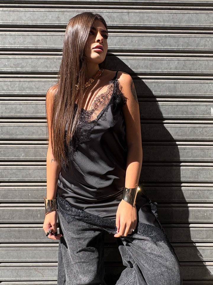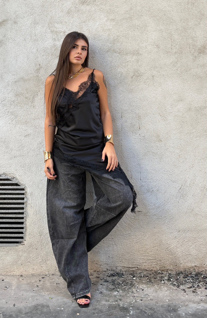 Top Effetto raso con bretelle lungo abbastanza da poterlo mettere anche a dress ha un taglio trasversale e porta il merletto sul seno e sul bordo