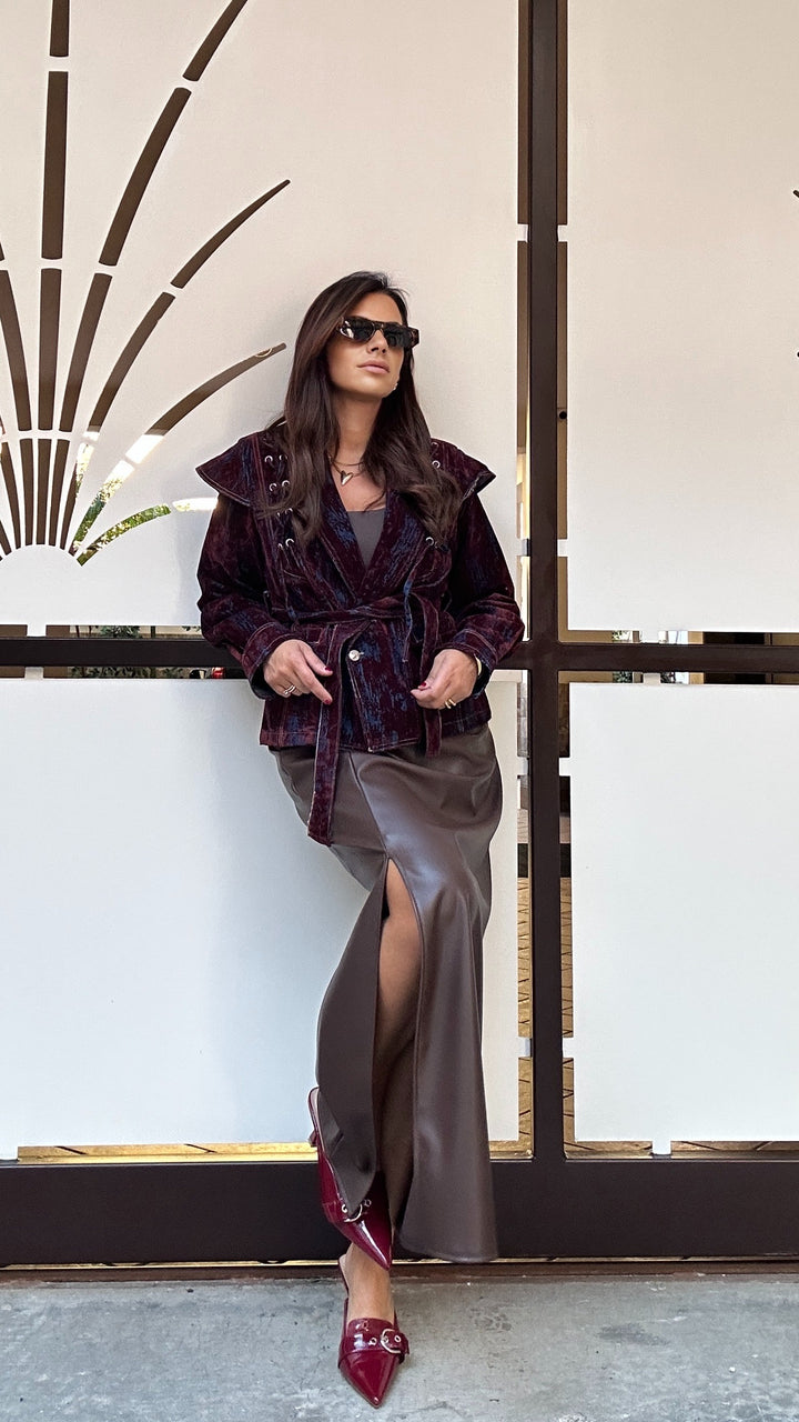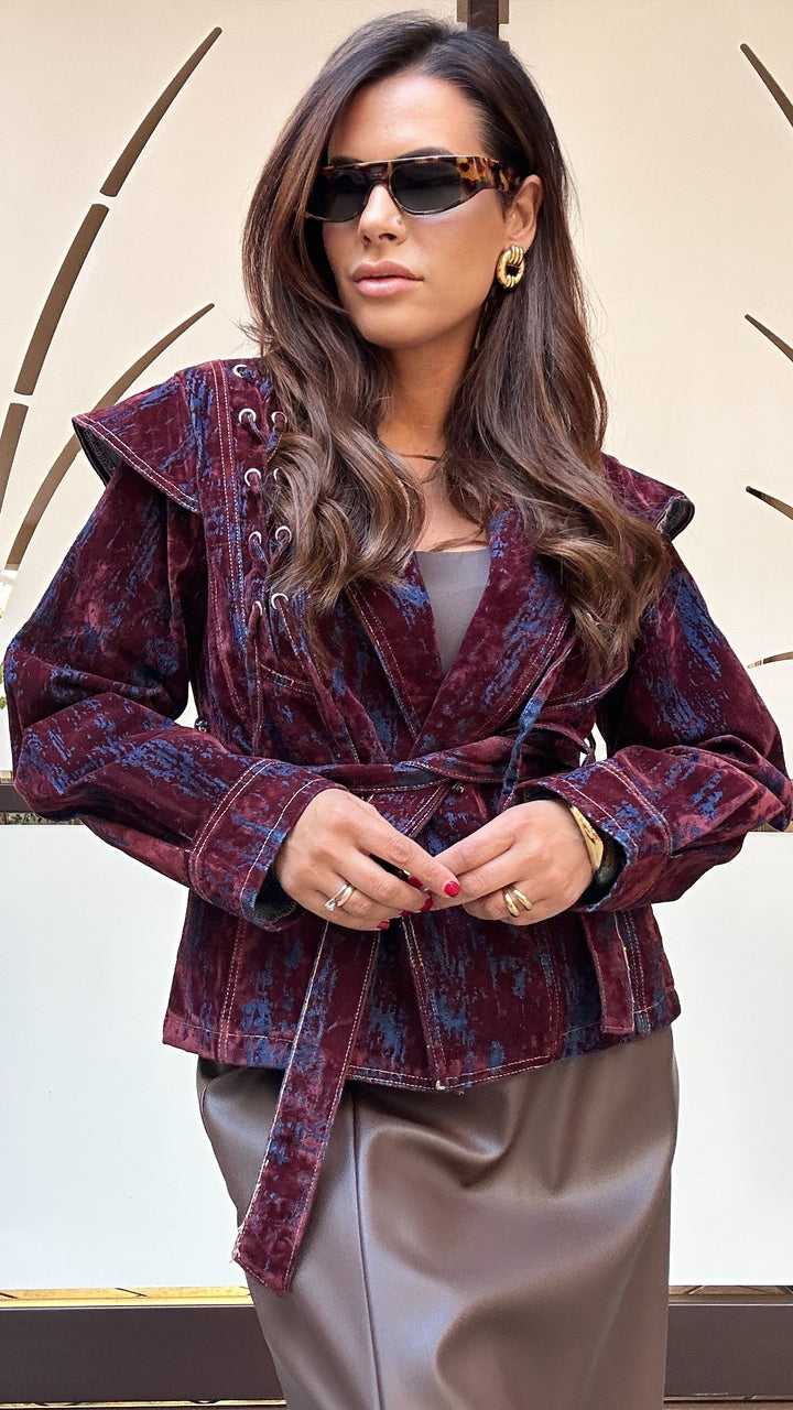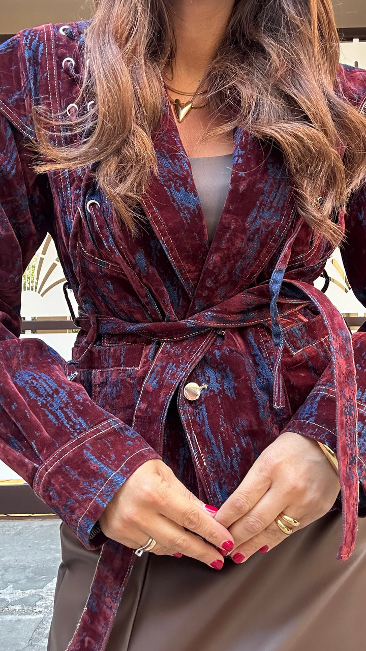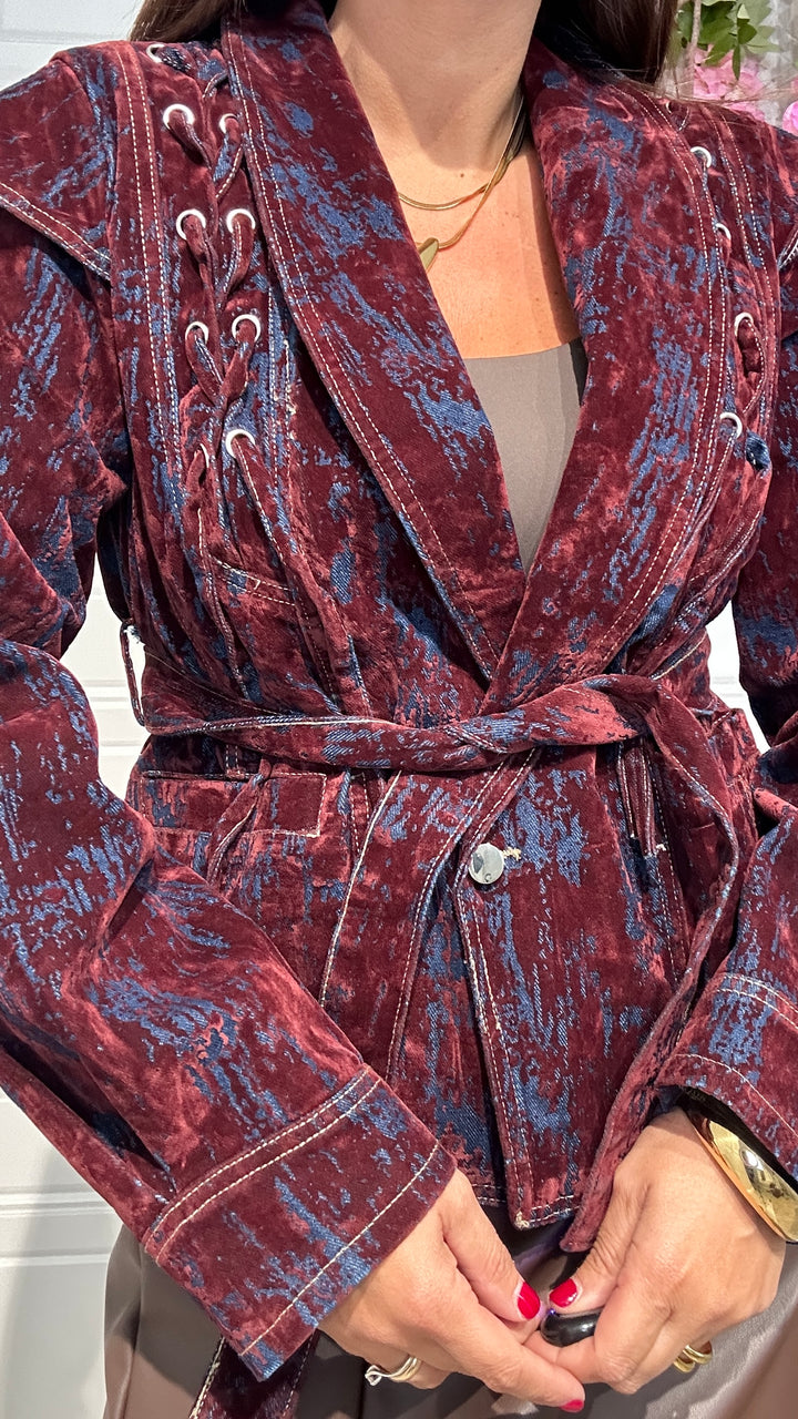Giacca in jeans e velluto fantasia astratta con questi misti tessuti l'insieme e praticamente uno spettacolo giacca strutturata sulle spalle e cintura in vita lo stesso tessuto dell giCca per definire il punto vita porta un solo bottone centrale e tasche vere sul davanti